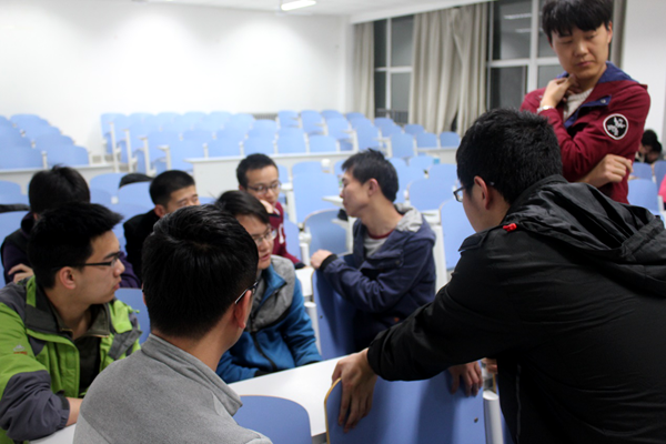 会议开始,张楠等5位12级学生做了简单的自我介绍,包括考研分数和考入的学校。接下来,参加会议的13级学生分成5组和5位12级学生进行考研经验的交流。数学怎么复习、英语知识点怎么背诵、政治如何理解都是交流的主要内容,更深入的还包括面试技巧和如何面对调剂学校。12级学生对大家的提问都做出详细的回答,把自己的考研经验分享给大家,也对13级学生表达一份祝福。