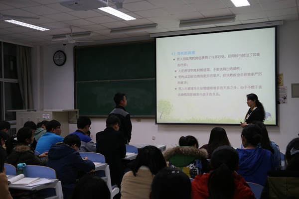 王老师多年从事大学生教育与研究工作,本次讲座从性别角色与适应、培养爱的能力、树立正确就业观三个方面展开,主要讲述了大学女生对自我角色的认定,对大学恋爱的看法以及对自身未来的规划。王老师以一个个生动有趣的小故事,解释和说明了大学女生的困惑和主要问题。“事业和家庭同样重要,而且家庭的幸福感会让你在工作中更有动力,反之亦然”、“失恋并不就是失败!”王老师给在场同学一条又一条生活金句。当谈及大学生恋爱问题时,不同于以往老师“不鼓励,不反对”的中立政策,王老师提出:“大学就应该有一场轰轰烈烈的恋爱!”最后,王老师通过现场提问的环节再次解答了同学们的各方面的疑问。