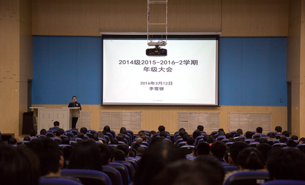 3月12日晚7点,信控学院2014级新学期年级大会在南教100召开,会议由2014级辅导员李雪银、王力禾主持,我院2014级全体学生参加了会议,。