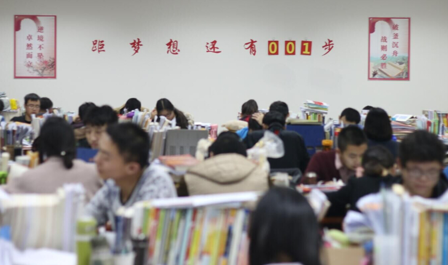 在图书馆8楼的考研自习室里,书籍满桌、座无虚席,不少桌子上放着缓解眼睛疲劳的绿色盆栽,墙上“距梦想还有007天”的标语格外醒目。“天道酬勤,恒者能胜!”在自动化1203班李晗的内心里,这句话一直激励着他前行。