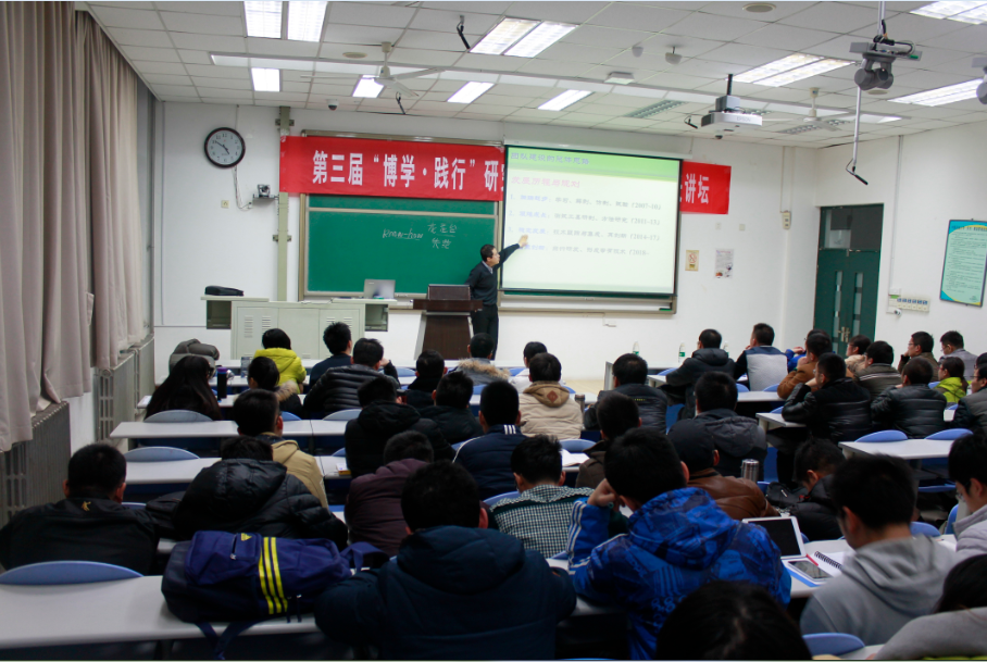 耿院长以亲切而幽默的姿态呈现在大家面前,一开始便给大家播放了一段鸭妈妈带领一群小鸭子爬台阶的励志视频,短小而震撼的视频让同学们感受到无论在生活中还是在学术研究中,要不断进取、勇于尝试终能获得成功。随之以“研究生的能力培养”为主题,从一名院长及硕士生导师角度展开了本次讲坛。耿院长首先抛出为什么读研究生以及怎样读研究生的问题,告诉大家研究生要树立明确的目标和梦想,并为之不懈努力。继而强调了研究生学习要掌握知识与方法,在学习的过程中注重思考,培养独立思考的习惯。最后耿院长以自己带领研究生们做的项目为例给在场的所有研究生讲述了如何了解课题,如何使用四大著名检索数据库进行检索,并进一步阐述了创新的重要性以及团队合作的必要性,告诉大家要快乐学习、快乐生活,学会调节自己的心态,使兴趣贴近自己更擅长的目标,坚持不懈,努力奋进并最终获得成功。