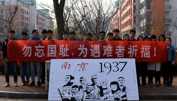 12日晚7点,电子1403班全体同学于南堂112观看了有关纪念南京大屠杀的影片,看完影片之后,全体默哀三分钟,为遇难的同胞哀悼。13日中午,班级学生在玉兰餐厅西门举办了横幅签字活动,横幅上写着“勿忘国耻,为遇难者祈福”这九个大字。路过的学生在横幅上写下自己的名字和寄语。“忍辱负重,卧薪尝胆,发愤图强,十年生聚,再与倭寇抬头相见”,一名同学写到。