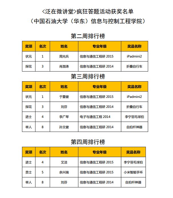 在10月11日―11月7日为期四周的答题活动中,石大有11名学生获奖,其中9名来自我院。特别是我院2015级研究生周光兵和于雷健分别获得第二周、第三周全国周冠军。在11月9―20日举行的最佳人气奖评选活动中,我院2014级研究生肖渤涛排名全国榜首。