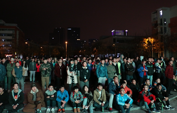 中场结束,比分依旧是0比0。比赛进行到54分钟,恒大队的埃尔克森上演博格坎普式过人,攻破了阿赫利的大门,恒大以1比0领先。一时间荟萃广场沸腾了,广场附近的宿舍楼内也传来了阵阵欢呼。同学们精神倍增,更多同学加入了观球的队伍里。当比赛进入补时阶段恒大仍然保持领先,同学们看到了恒大夺冠的希望,一起倒计时,期盼着胜利一刻的到来。当比赛结束的哨声终于响起,一声声“冠军”的呼喊让空气中洋溢起幸福的气息。