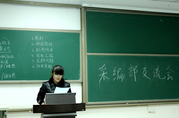11月15日晚,信控学院新闻工作室第15期知新讲堂――采编部工作交流会在南堂215举行,部长庞启华、副部长刘思怡、新闻管理员张林静等人为采编部的见习记者们讲解新闻知识,旨在提高见习记者的新闻水平,总结得失,更好地开展后续工作。庞启华带领着大家分析校报的学生版块,他建议大家:“要多看校报,如果有意向往某个版块投稿,就应该去研读这个版块的文章,总结思路,在模仿中学习和创新。”刘思怡根据近期稿件情况向在场成员提出几点关于采访流程、新闻格式和发稿格式的建议和要求,并对修改新闻稿件的注意事项进行了总体阐述。张林静给在场成员发放新闻修改的材料,要求大家仔细分析两篇病文,指出其中的不足,并提供修改意见。张林静总结评析了病文所存在的问题,并告诫大家:“一定要注意这些经常出错的问题,如果我们存在这样的问题,就要改正;如果没有,那我们就要防范。”大一新成员进行成果汇报,十余名成员依次上台汇报自己近期在各类新闻媒体上发表的稿件数目,并讲述未来的奋斗目标。采编部交流会在庞启华为部门成员分配下周新闻任务的环节中走向尾声,