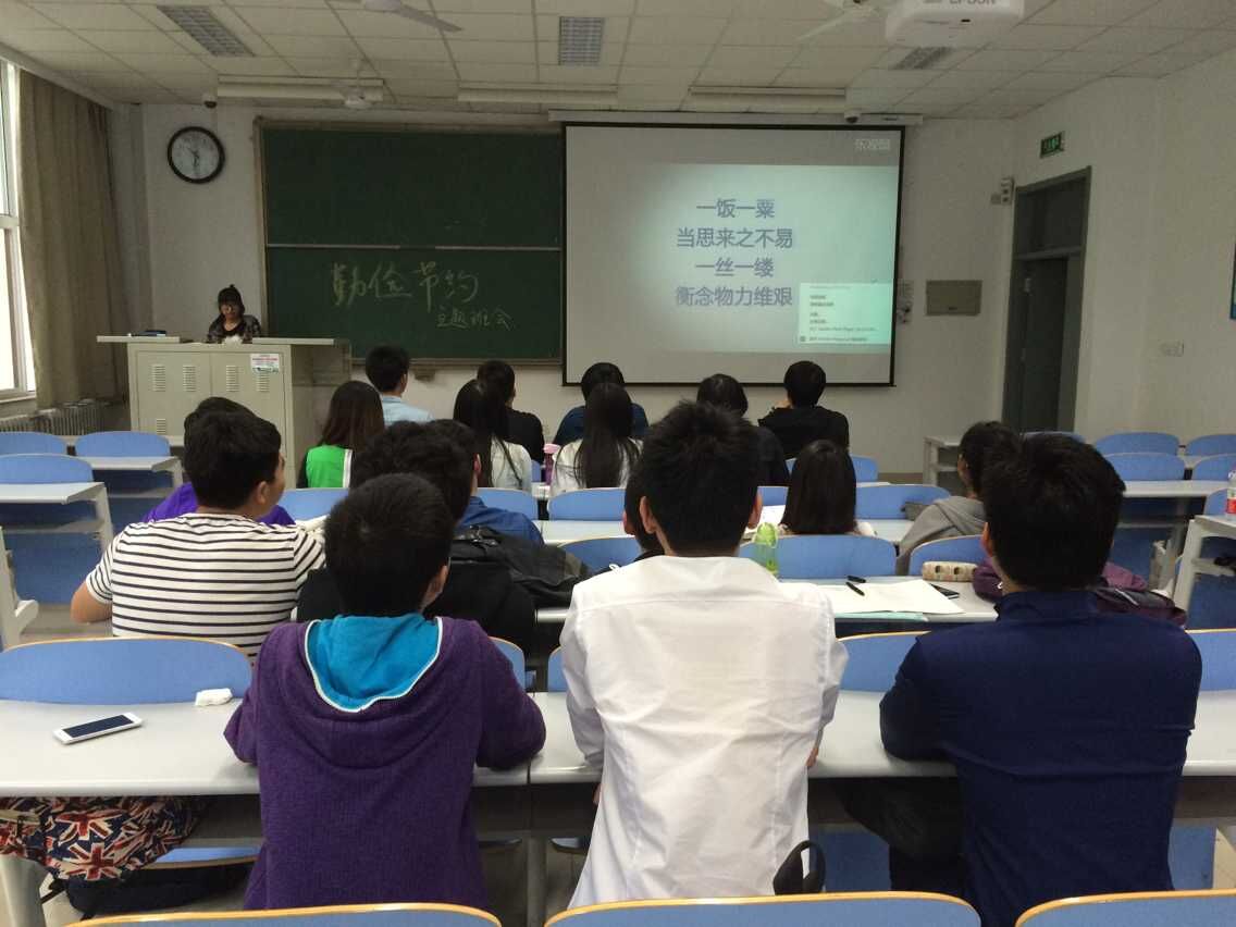 本次班会由团支书王嘉会同学主持,班会首先列举了社会和校园中一些不和谐的浪费现象,然后为大家播放“勤俭节约――从舌尖做起“的公益视频,从多视角展示勤俭节约的重要意义。大力倡导勤俭节约从身边做起,从每位同学的日常生活做起。班会后同学们纷纷表示:“一饭一粟,当思来之不易;一丝一缕,衡念物力维艰。要将勤俭节约的思想落实到行动中去。”