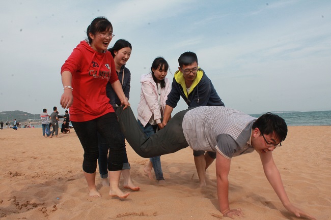 在到达金沙滩各个学院完成报道后,大家便分别在沙滩上开始进行团体游戏。李建伟和魏炯带领着大家首先进行了“吹大风”的游戏。大家光着脚丫在沙滩上站成一圈,随着“大风吹,吹什么风”的口号不断交换位置,最慢的同学站在中间进行自我介绍并进行下一次喊号。生动有趣的方式让整个队伍迅速相互进行了认识。接着又进行了“排火车”、“鸡蛋-小鸡-大鸡”等游戏,每个游戏完毕后,失败者都要接受惩罚,并总结自己的失败原因,成功者则介绍成功经验。有趣的游戏过程却蕴含着简单深刻的道理:“排火车”教会大家合理利用每个的优缺点进行任务分配,“鸡蛋-小鸡-大鸡”告诉大家要想成功就要不断尝试。