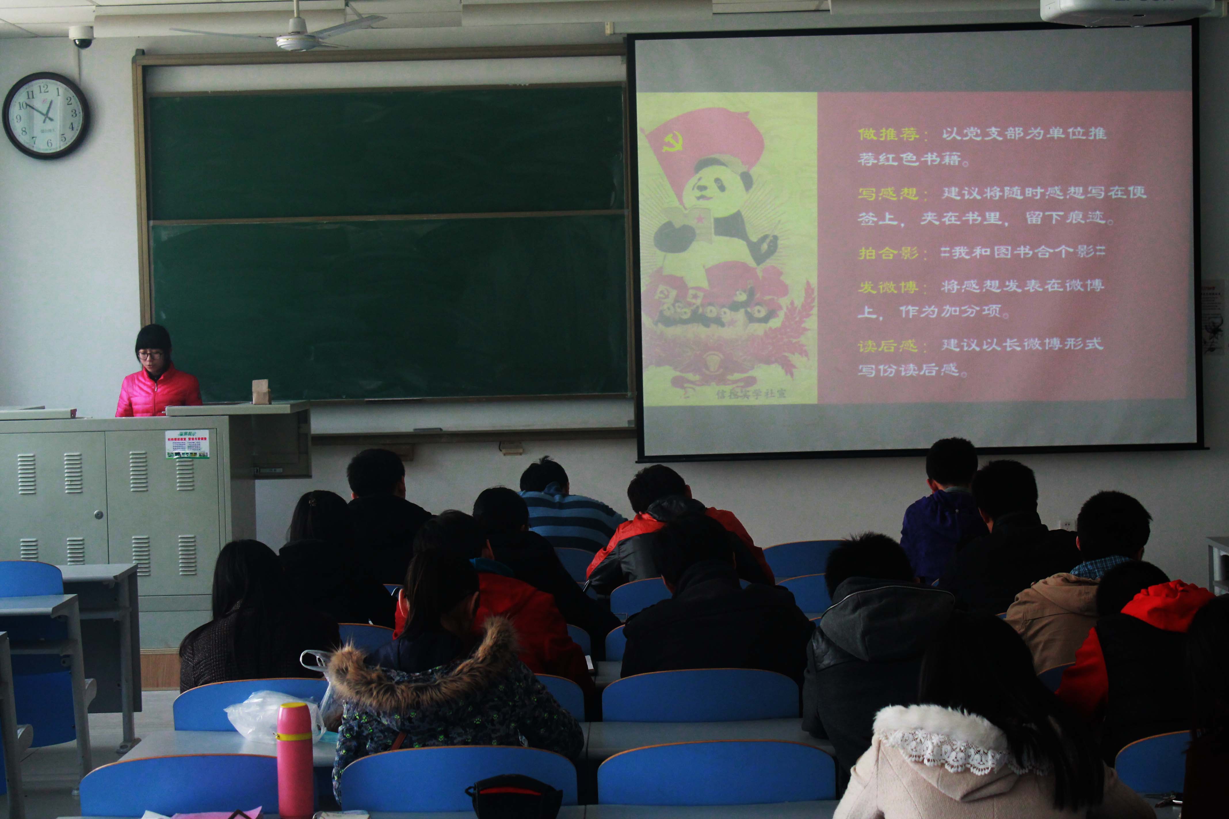 本次会议由学生党总支副书记姜飞主持。会上,姜飞首先向新一批的党员发展对象介绍了党员发展对象培训班的相关事宜,并就培训班的相关纪律进行了重点强调。随后由实学社社长曾菲、“信•基金”负责人张逸凯、组织部部长许颖和宣传部部长杨培培对即将开展的“红色名篇诵读比赛”、“读书月活动”“感动信控人物评选”以及实学社的各项常规考核工作进行了简单介绍。最后,姜飞对以上活动进行了简要总结和动员,他要求各支部的党员、干部积极参与到以“读书好、读好书、好读书”为主题的读书月活动中来,并呼吁大家在反法西斯胜利70周年这一重要历史节点积极开展爱国系列活动。