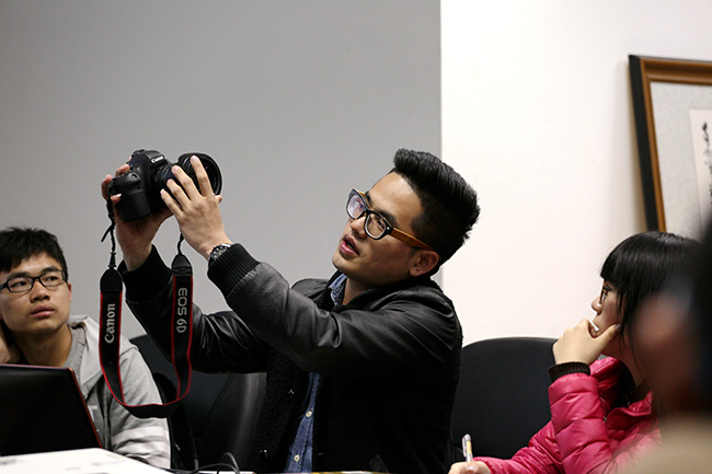 针对我院成员对单反相机关键词理解模糊的问题,杜浩着重介绍了摄影三要素:光圈、快门和感光度。他通过通俗易懂的比喻解读概念和定义,以便让在场学生记者们消化理解。在讲解过程中,杜浩详细阐述了光圈、焦距和景深的联系,指出了光圈的数值规律、最理想光圈的选取以及调整较好的位置。此外,他还对对焦原理进行了讲解,指出不同情况下如何选择手动对焦和自动对焦。随后,杜浩通过展示不同的摄影作品,讲解了构图的要求,并指出构图的极端重要性。讲解结束后,工作室成员张玉成说:“杜浩幽默的语言让我对一些概念有了清晰的认识,真的从心里感谢他。”