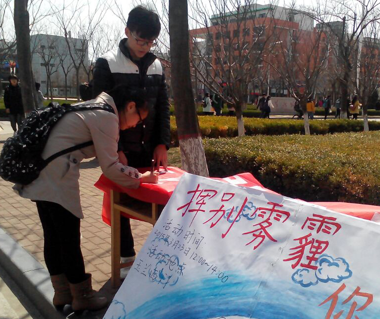 中午11点,星愿服务队的志愿者们在队长的带领下,为校园内学生讲解雾霾相关知识,并邀请大家在条幅上签名。在听到志愿者们热情的讲解后,了解到今天是世界气象日的大学生们纷纷在条幅上签下自己的名字,写下消灭雾霾的宣言。签名活动期间,一位老师从活动现场前路过,在看到展板上的“消灭雾霾”的呼吁后,又折回活动现场签字,并与志愿者们深入交流。他表示非常支持这类环保活动,希望以后校园内多举办这样的活动,来激发大学生的环保意识。