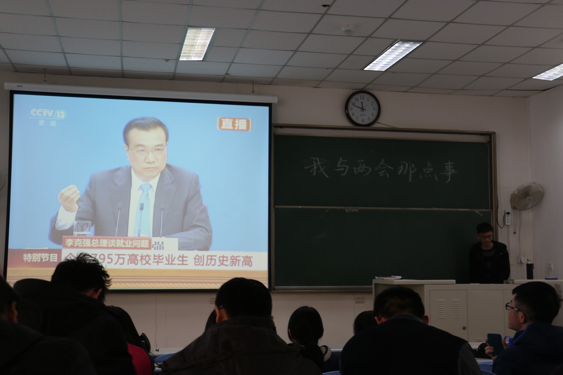 班会伊始,班长王一兆结合学习资料介绍了今年“两会”的主要内容,介绍了“两会”的意义及其召开背景,并带领同学们观看两会闭幕式及李克强总理答记者问等相关视频。通过视频的学习,学生们了解到食品安全、假冒伪劣、环保、医疗等国家关心的问题,还了解到与青年相关的买房、就业、教育、出国等政策也逐步落地,与会学生对个人和国家发展信心进一步增强。