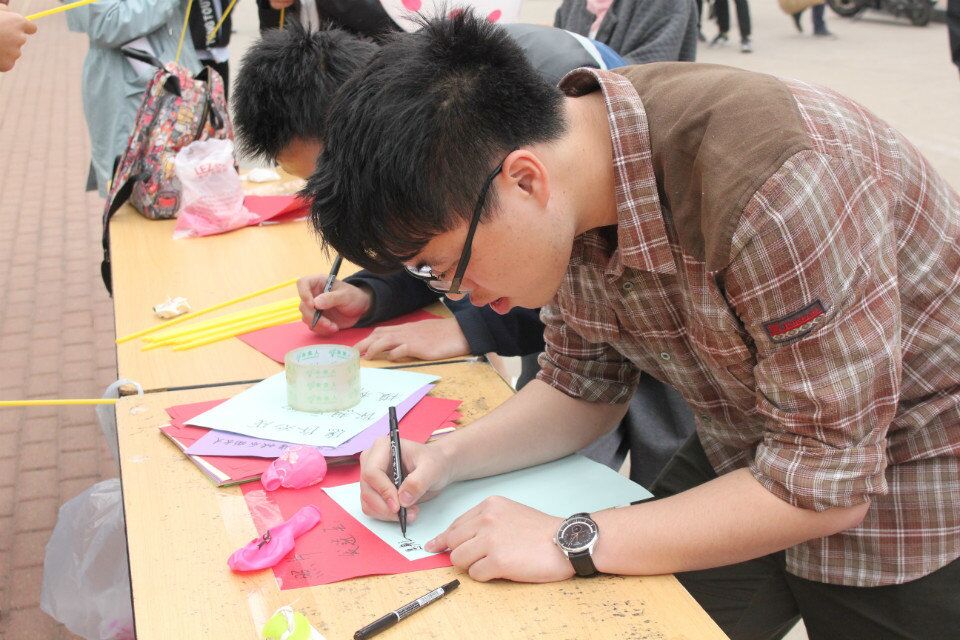 现场的学生们吹起了气球,作为送给参与者的礼物。彩色的气球吸引了不少学生和校外人员前来参加活动。一位路过的女士最先参与了活动,她按照指定的方式发送了自己的幸福照片,并在心愿卡上写下了自己对女儿的祝福:“希望宝贝健康快乐的成长。”越来越多的学生加入到活动中,现场充满欢声笑语。参与者在发送“幸福瞬间”照片的时候,也在谈论着照片拍摄时的情景,仿佛又回到了照片上的幸福时刻。