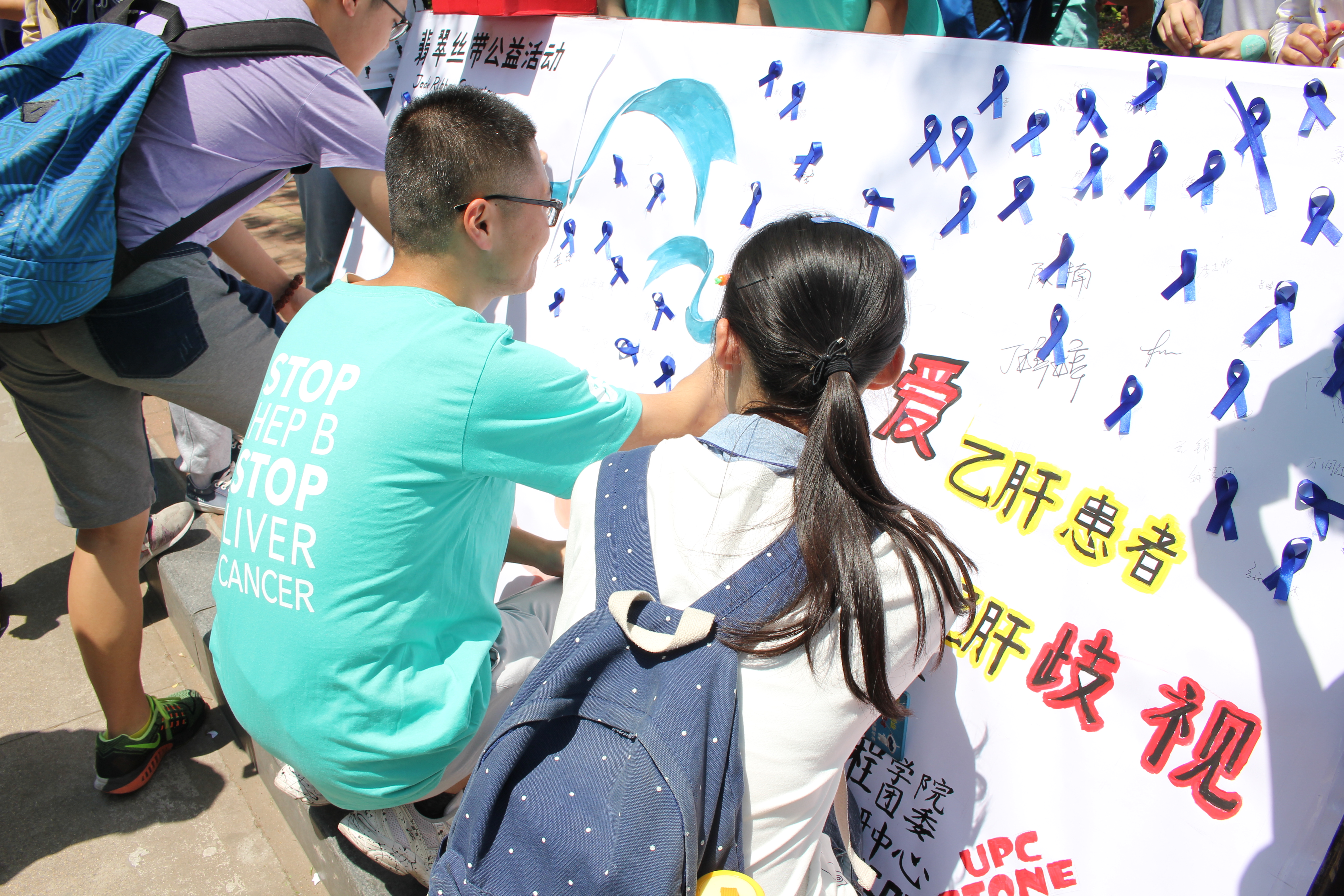 在五月的艳阳下,一群身穿着印有“STOP HEP B,STOP LIVER CANCER”字样薄荷绿T恤的学生向来往的行人发放“了解乙肝,预防肝癌”的宣传册,引来学生驻足观看。本次活动邀请学生了解乙肝知识,并参与乙肝知识有奖竞答,根据答题正确的数量领取相应的礼品。活动现场,每个人都佩戴着印有“STOP HEP B,STOP LIVER CANCER”的贴纸,踊跃地进行乙肝知识答题。活动成员还为参与者发放“翡翠丝带”,他们把代表着“全球人士齐心协力对抗乙型肝炎和肝癌”的“人”字形丝带贴到展板上,签署自己的名字,表达自己齐心协力,共抗乙肝的决心。五颜六色的展板上交织着宝蓝色的丝带,构成了校园内的一条靓丽的风景线。