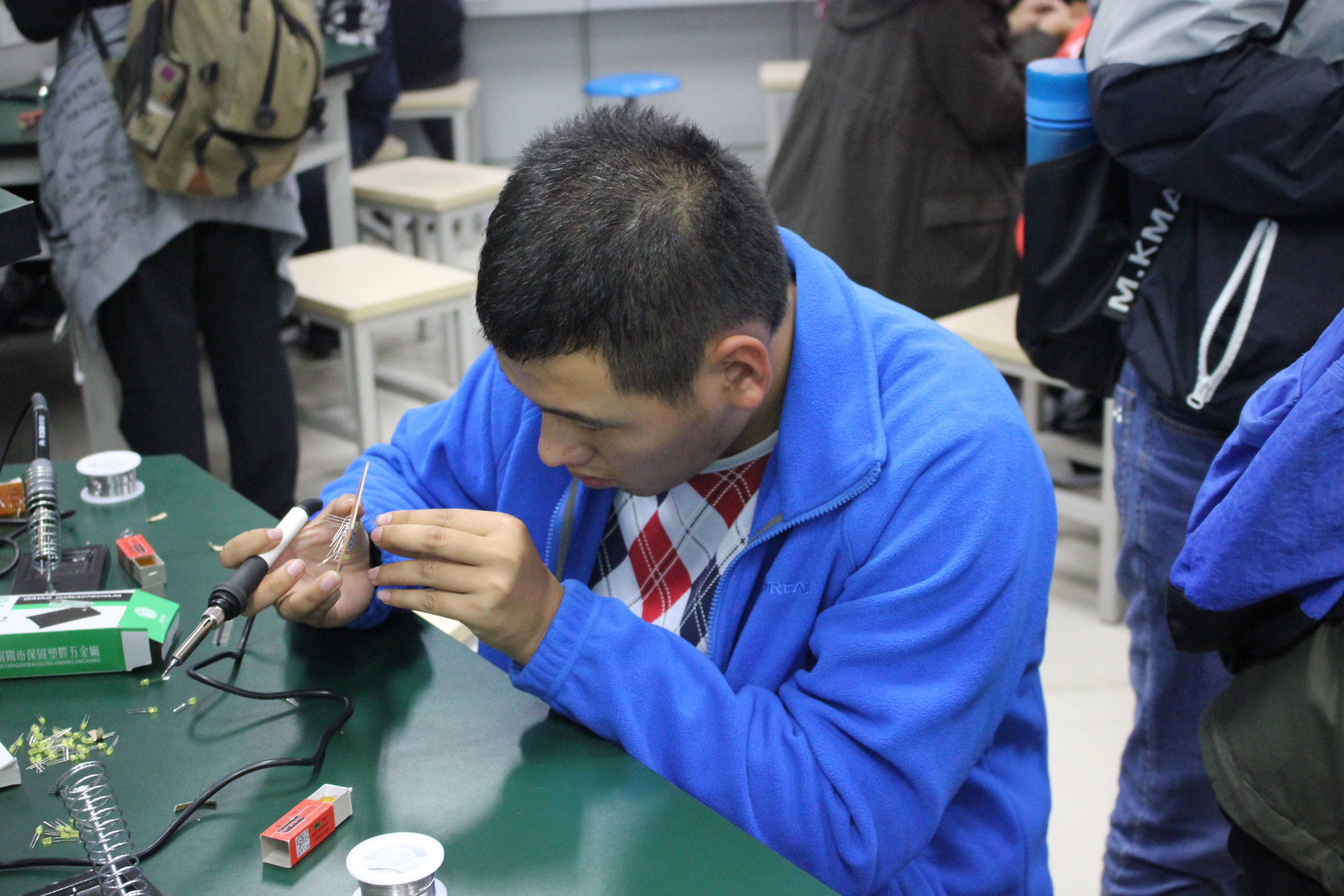在整个培训过程中,同学们都积极参与,每个实验桌都有一名高年级协会成员参与,悉心把操作技巧教授给新生。“焊接时一定要注意焊接表面是否干净,如果干净涂上助焊剂,焊接会很迅速、很坚固。”“焊丝熔化一定量后,要立即将焊丝向左上45°方向移开!”烙铁、印制电路板堆了一桌,学生们在指导下认认真真地操作着。
