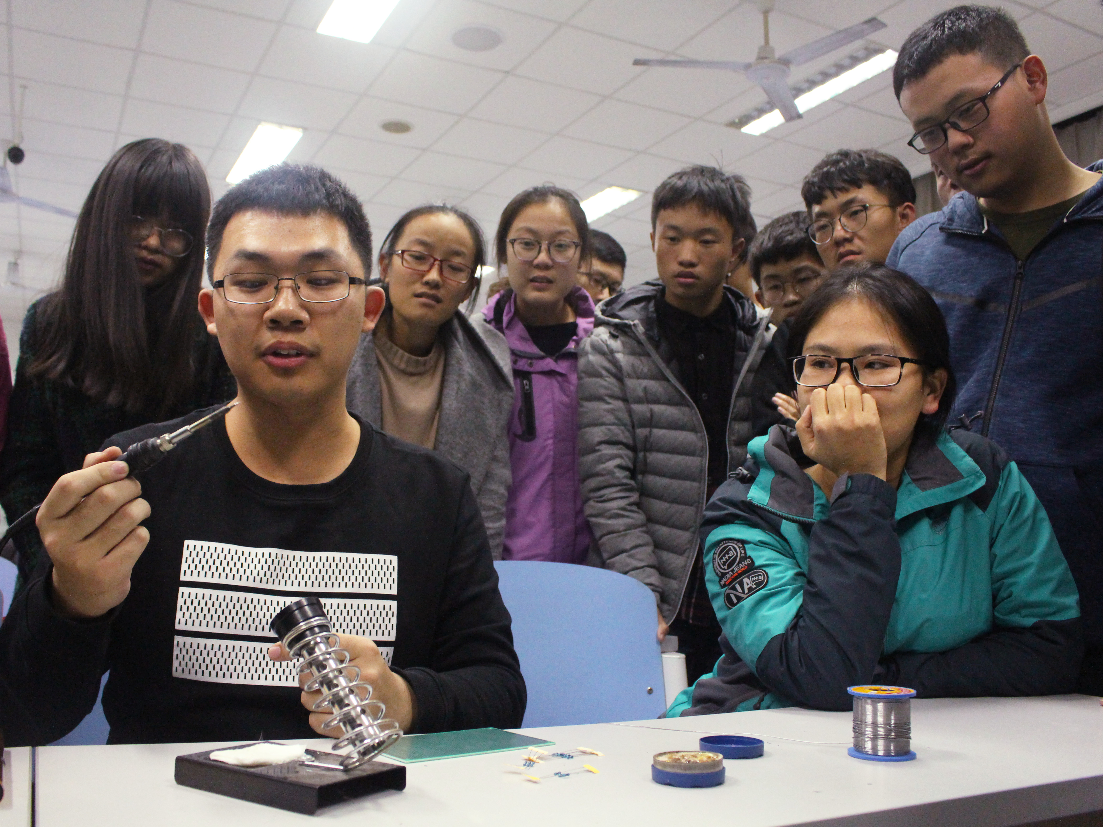 培训中,王远泽主要介绍了在焊接电路板过程中需要的工具、载体,讲解了电烙铁、松香、吸锡器等工具的原理并且提出了采购建议。为了让现场学生更直观地感受焊接电路板的过程,承办方在现场放置了数套焊接工具并组织学生进行了过程演示的观摩和实际操作尝试。自动化1604班的吴鸿声在演示中强调:“电烙铁的头部需要及时清理,这样能够保证锡贴到电路板上。同时,注意不要把锡丝戳进洞洞板里,防止熔锡透到另一面。”装元器件、点点、走线,学生们在工作人员的指导下拿起了电烙铁进行焊接尝试。“实际操作跟看起来很不一样,真正动起手来还是很不容易的。不过从生疏到熟练是一个快乐的过程。”自动化1701班的徐易安在操作后说道.