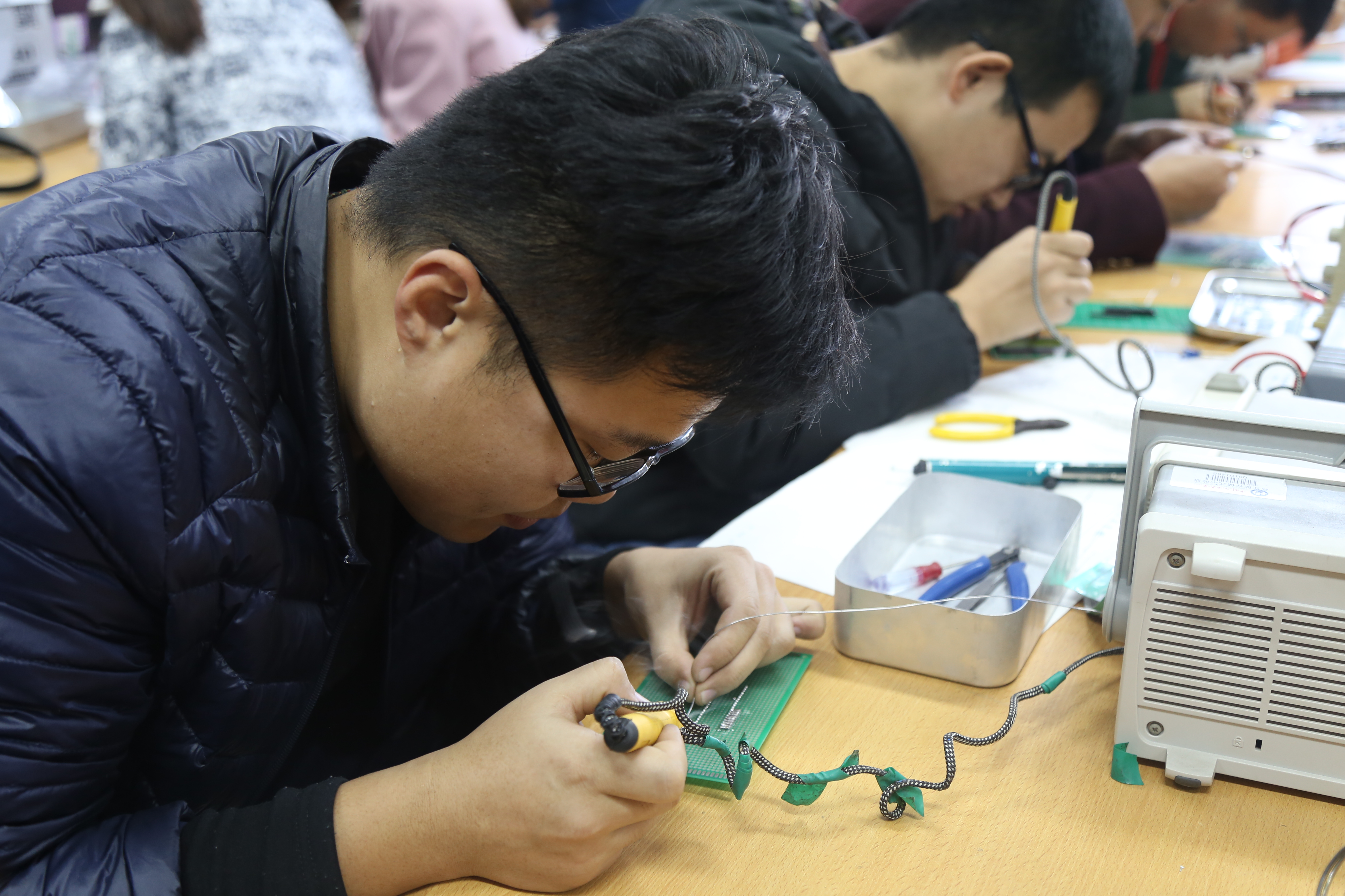 学生在认真焊接电路(摄影:张冕桐)