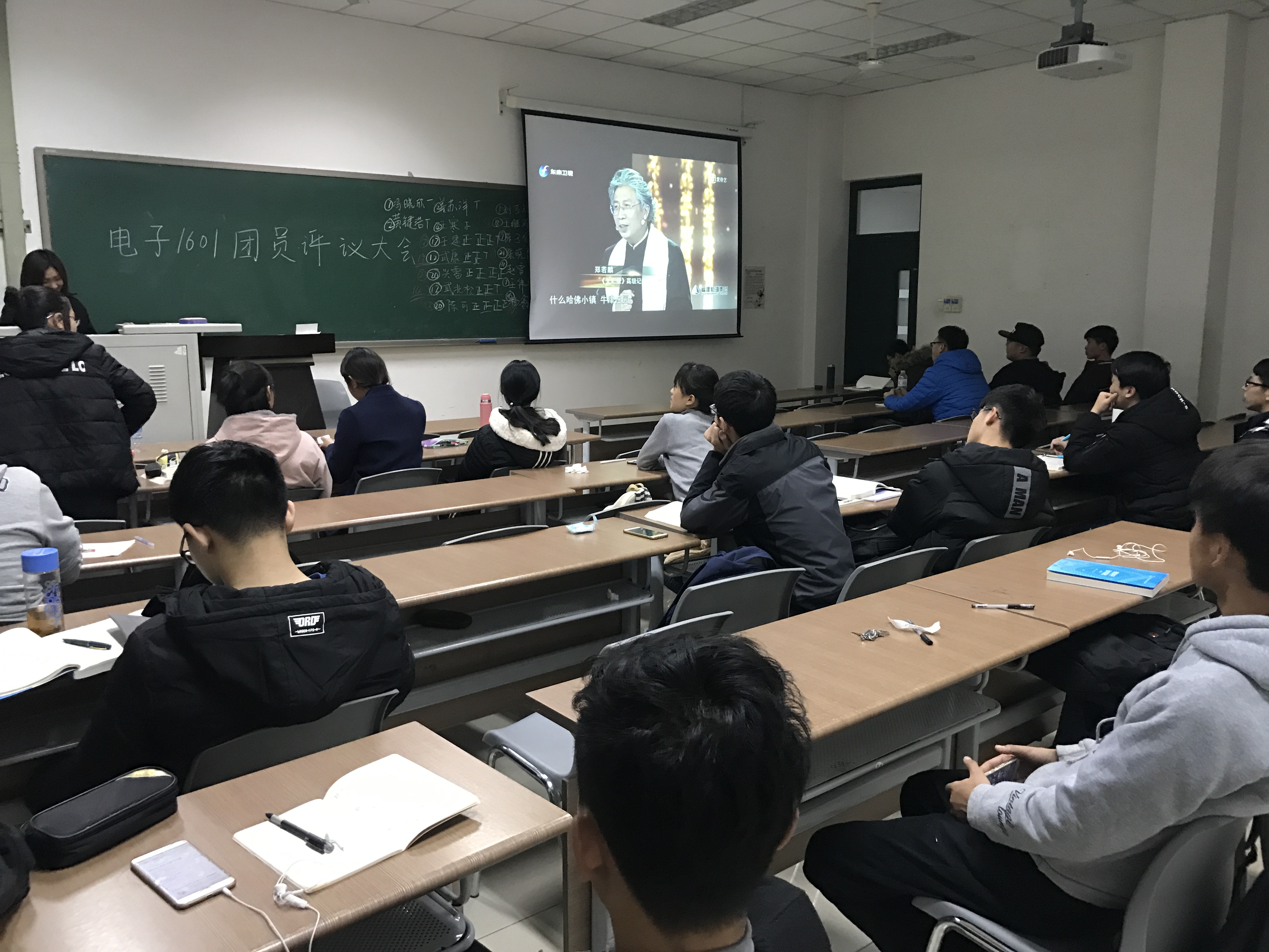 团支书潘婷对团员评议规则进行了讲解,电子1601班全体学生依次上台对个人本学期生活、学习方面做了总结,学生们发言结束后进行班内投票,在宋明悦以及史成熙的监督下进行唱票,最终选举出十名优秀团员。在评议结束后,潘婷关于督促大家学习十九大精神进行了陈述“作为当代青年人,我们要有文化自信和民族自信。要树立远大理想,并积极的为之奋斗。同时还要把自己的梦想同伟大的中国梦相结合,为国家贡献力量”,随之播放了《中国正在说》,让学生们进一步体会中国力量。