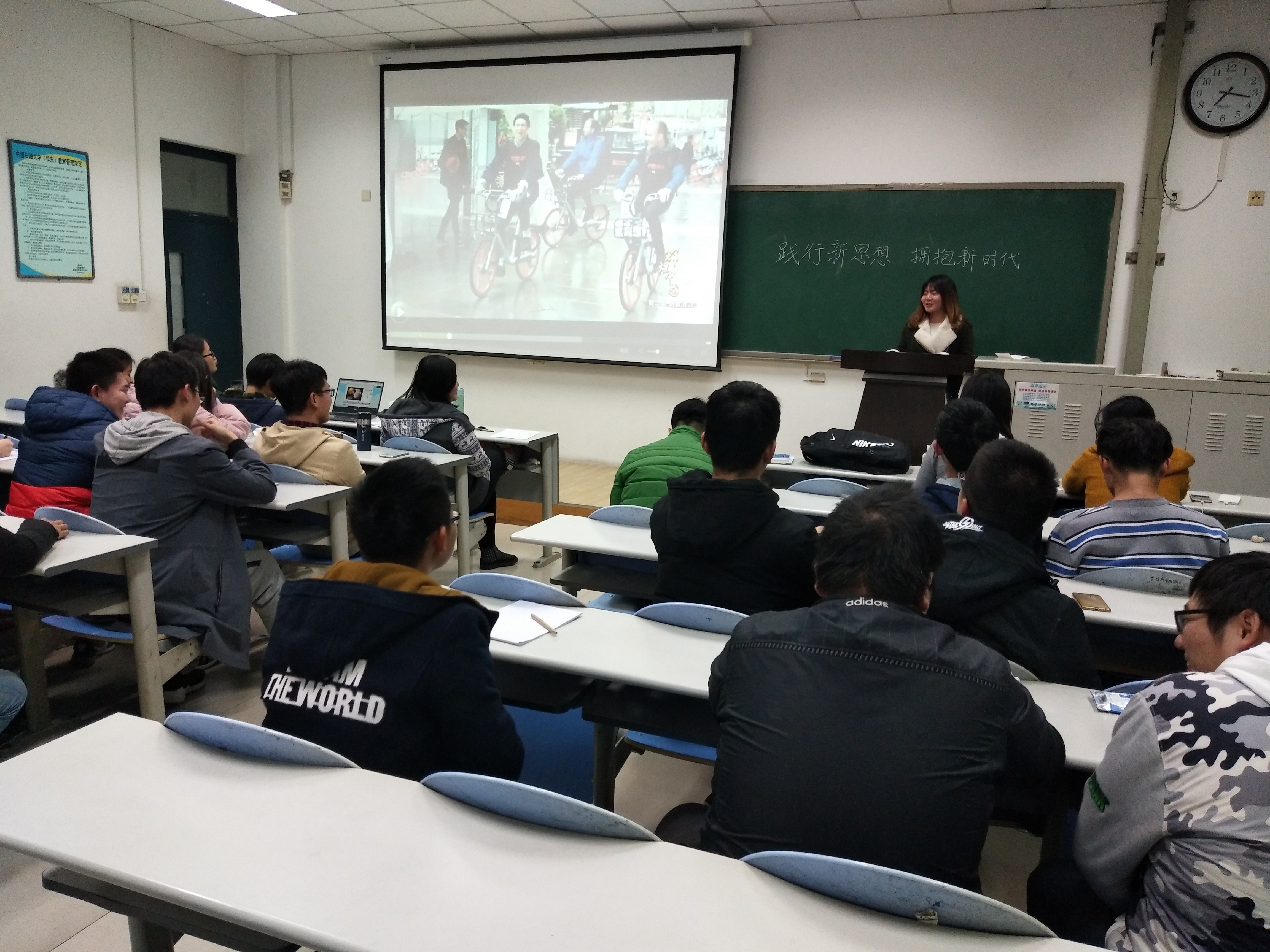 会议开始,全体成员一起观看了纪录片《辉煌中国之创新活力》,了解祖国最新生活形式与创新发展,更好的理解“践行新思想,拥抱新时代”主题的含义。视频结束后,班内各位团员上台陈述自己近期在学习、活动参与、宿舍卫生等方面的表现。陈述结束后,张敏为各位同学讲解了投票、唱票的各项规则,学生们开始投票。在吕昊昱、邵明珠的监督下开始唱票,最终选出常来宾、王文涛等十名优秀团员。评议结束后,张敏督促同学们积极学习十九大精神,学习习近平新时代中国特色社会主义思想。“积极了解时代新思想,开阔创新,更快更好的融入新时代,才能成为引领时代潮流、全面发展的大学生。”张敏说道。