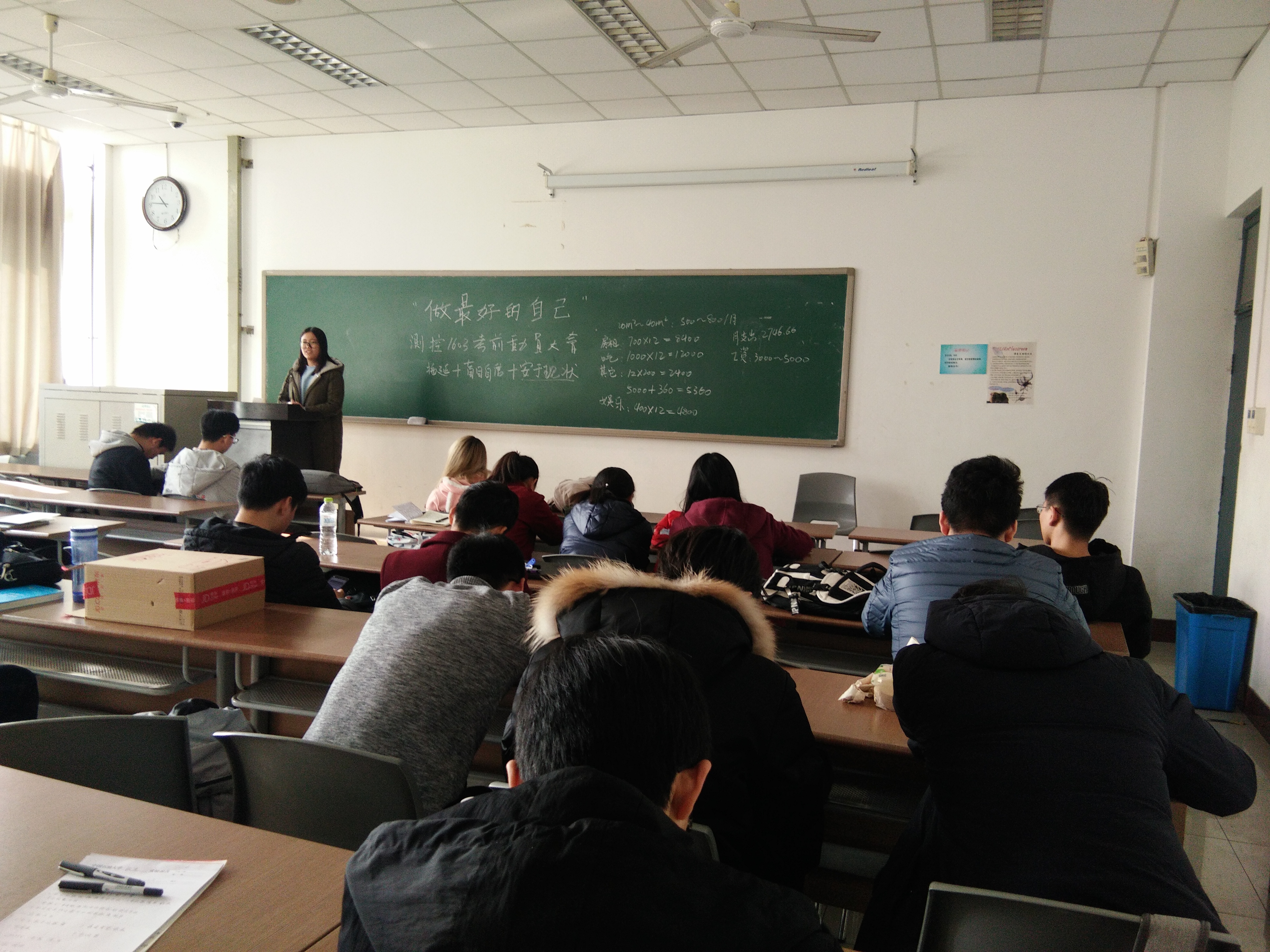为提高学生学习的积极性,让学生们认清自我,积极备考,测控1603班于12月29日上午在南堂513室召开“做最好的自己”主题考前动员大会。班会由班长王雪涵主持,测控1603班全体成员参加。