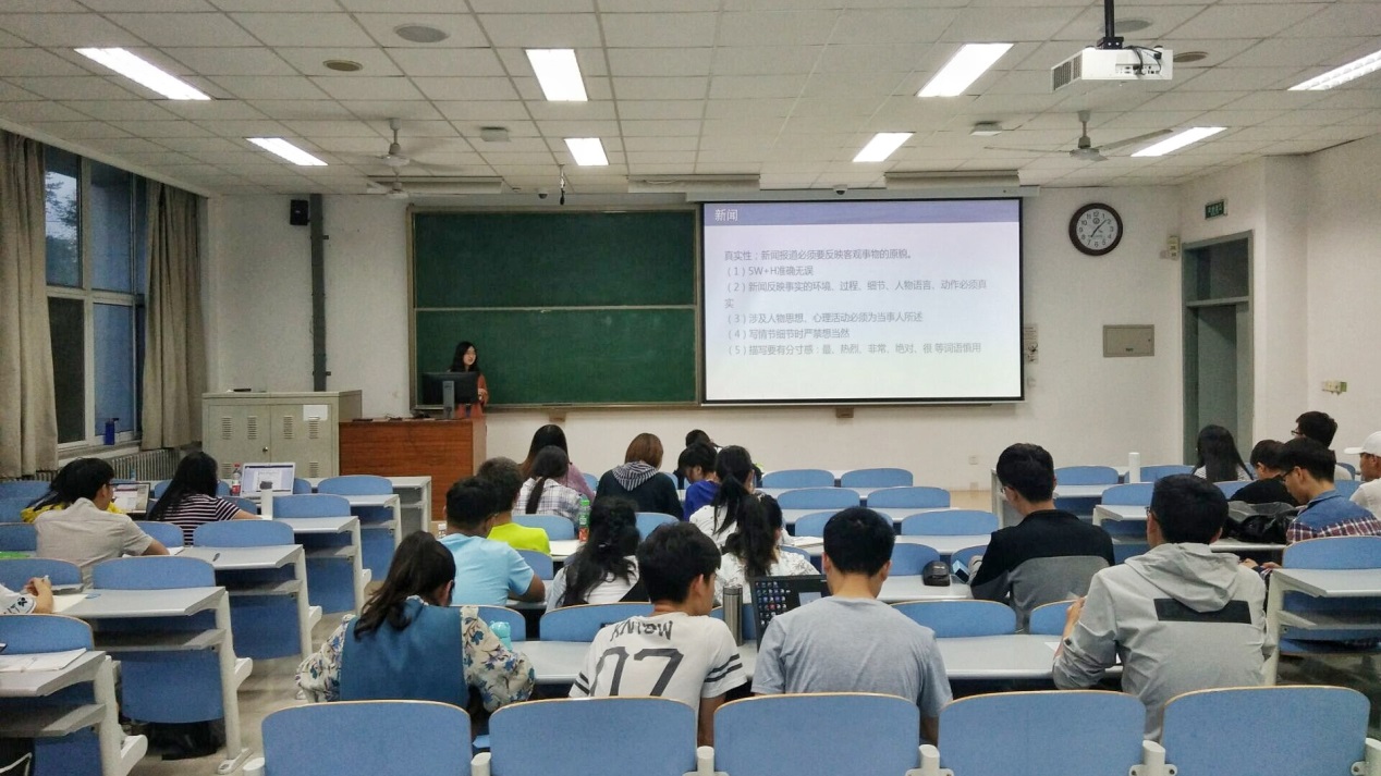活动伊始,郭慧洁从新闻的分类及格式、消息及通讯类新闻写作、摄影及组图类新闻写作和外宣四个方面分享了新闻的写作与摄影技巧以及自己在新闻写作过程中的一些经验。她首先强调了新闻写作最基本的要求——真实性。“新闻报道必须要反映客观事物的原貌。”“在写作的过程中,我们应使用新闻语言,避免个人主观色彩带入,慎用最、热烈、非常、绝对、很等词语。”接下来,她重点讲到了新闻的标题、主体和结尾写作技巧。例如,新闻的标题应简明扼要和准确,如果加入适当的文艺成分会更吸引人。随后,她以多篇稿件为例,分别阐述了消息类、通讯类和组图类新闻的特点及写作方法。最后,她向成员们讲解了摄影技巧,并列出多张优秀新闻照片,强调一张合格的新闻照片应该具有横平竖直、对焦清晰、曝光准确和主题突出等特点。