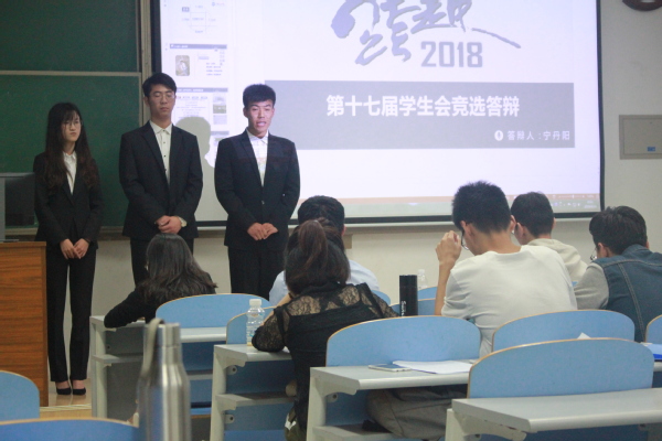为促进学院内后期工作的有序开展,同时为学生会注入新鲜血液。6月14日晚,我院于南教212教室举办了第十七届学生会干部换届竞选会。学院团委书记、研究生辅导员姜飞,学院本科生辅导员王力禾、曾菲、宋杰、蒋仁福及现任学生会主席闫娜出席了会议并担任评委。本次会议由16级学生会主席助理宁丹阳主持,2016级、2017级各班部分干部参加。