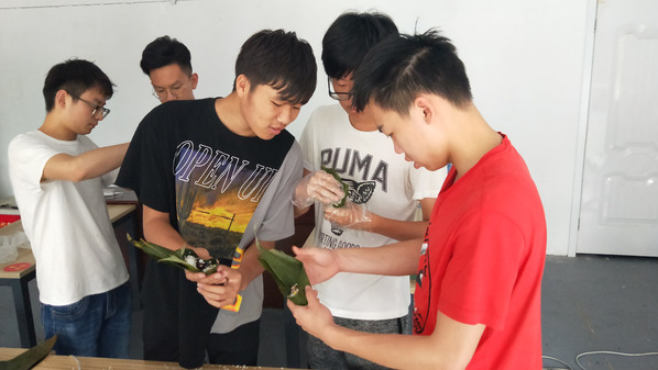 粽香端午,真真飘香:中国的饮食文化贯穿了中国的历史发展,端午节最明显的特征当然就是粽子。电子1703班班干部提前去超市买好了粽叶和八宝米,于6月18号上午在11号公寓活动室组织同学们开始包粽子。活动开始时,很多同学都不知道如何包粽子,手忙脚乱,缠线时会有少许糯米掉出来。但同学们仍聚精会神的包着粽子,一层一层将粽叶裹紧八宝米,再将棉线一圈一圈缠绕系紧。正如孰能生巧,同学包的粽子渐渐从会漏米到初见形状,再到小巧可爱。临近中午饭时间同学们迫不及待的将粽子送去餐厅炊熟,吃着自己亲手包的粽子,同学们脸上挂着笑容。即使在异乡无法与亲人团聚,和同窗一起庆祝端午也有一番趣味。