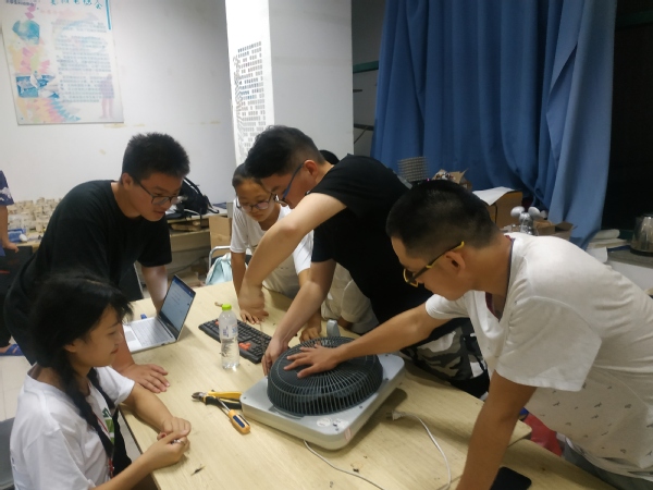 会议伊始,队长陈英杰强调了维修家电时用电安全的重要性,提醒队员们对居民送来的家电进行记录与整理。随后开始培训,培训共分为三大部分:第一部分是掌握维修家电所需仪器的使用,李正喆为队员们细致地讲解了万用表、电烙铁、吸锡器、示波器等维修所需工具的用法,并鼓励队员们用电烙铁连接电子元件,用吸锡器修改部分电路;第二部分是了解生活中家电容易出现的问题及相应的解决方法,张天宇为队员们介绍了家电容易烧坏的原因及预防措施,总结了有些家电中的电机不工作的情况并提出了检查修理的方案,讲解了家电中一些指示灯不亮的原因并针对不同的损坏情况提出相应的解决办法;第三部分是实际操作,刘凯旋带领队员们拆卸了一台有故障的小风扇,经过测试后队员们发现问题所在,并对它进行了一番改造,使小风扇成功地转了起来。