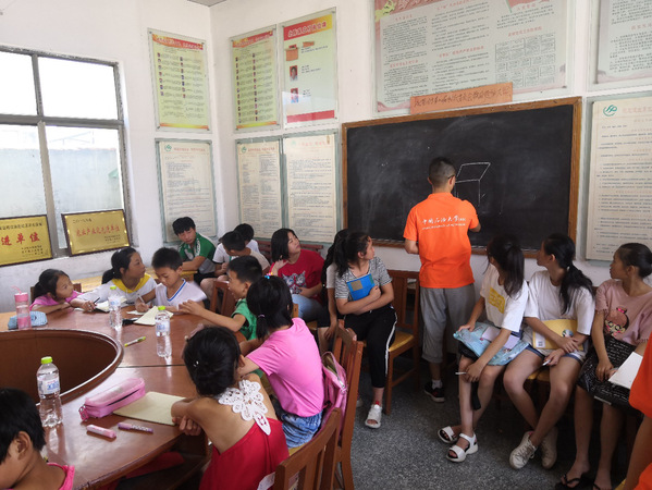 伴随着冉冉升起的朝阳,太阳集团tyc234cc蜗牛支教队开始了第二天的支教旅程。第一节课是蜗牛支教队队员王胜杰带来的趣味数学,王胜杰和孩子们一起做了几道趣味题,并且给孩子们讲解了高斯算法,课堂气氛变得活跃。孩子们积极举手回答问题,展开了热烈讨论。其中一位叫做陈洪宇学生因为年级稍大些,所以思路较活跃,课上多次主动发言,带动了课堂气氛。