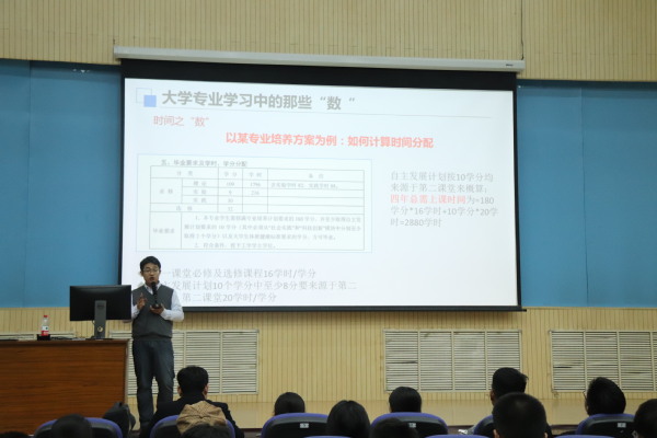 孟兆刚讲道“数是数据,术是方法”。在“数”的方面,他从“时间之数”、“学分底线之数”和“国家大势之数”三个方面进行讲解。他举出《2018本科生培养方案》是了解本专业的由来,专业是什么和学生们大学四年里应该做什么的重要指南,根据培养方案,学生应该规划出大学四年里可支配的时间应该拿来做什么。接着,孟兆刚又讲到,毕业要求是学生在本科要达到的知识能力,而培养目标即学生五年后的发展状况,他希望学生们不能只盯着毕业要求,参与活动时要想想此次活动对达到毕业要求和培养目标有没有帮助。孟兆刚指出“白天求生存,晚上求发展。”如果学生能在晚上拓展别人没做的,那么他就会有意外的收获。紧接着,孟兆刚列出了2017-2018各院学生不及格人次的一览表,希望从这起到警醒作用。接下来,孟兆刚提出了“大学知识学习有什么用?”和“大学课堂上学的很多知识都过时了,怎么办?”两个问题,并为学生们解答道,“大学学习的知识告诉我们如何去描述世界、推演世界、改造世界-而这一切都得从理论知识开始。”“站在巨人的肩膀上去更快速、更优化、更精确地去描述、推演、改造何来过时之说呢?”最后他总结道:“大学的基本要求是:优良的学风环境、卓越的学习标准、端正的学习态度、科学的学习方法和合理的学习习惯。”