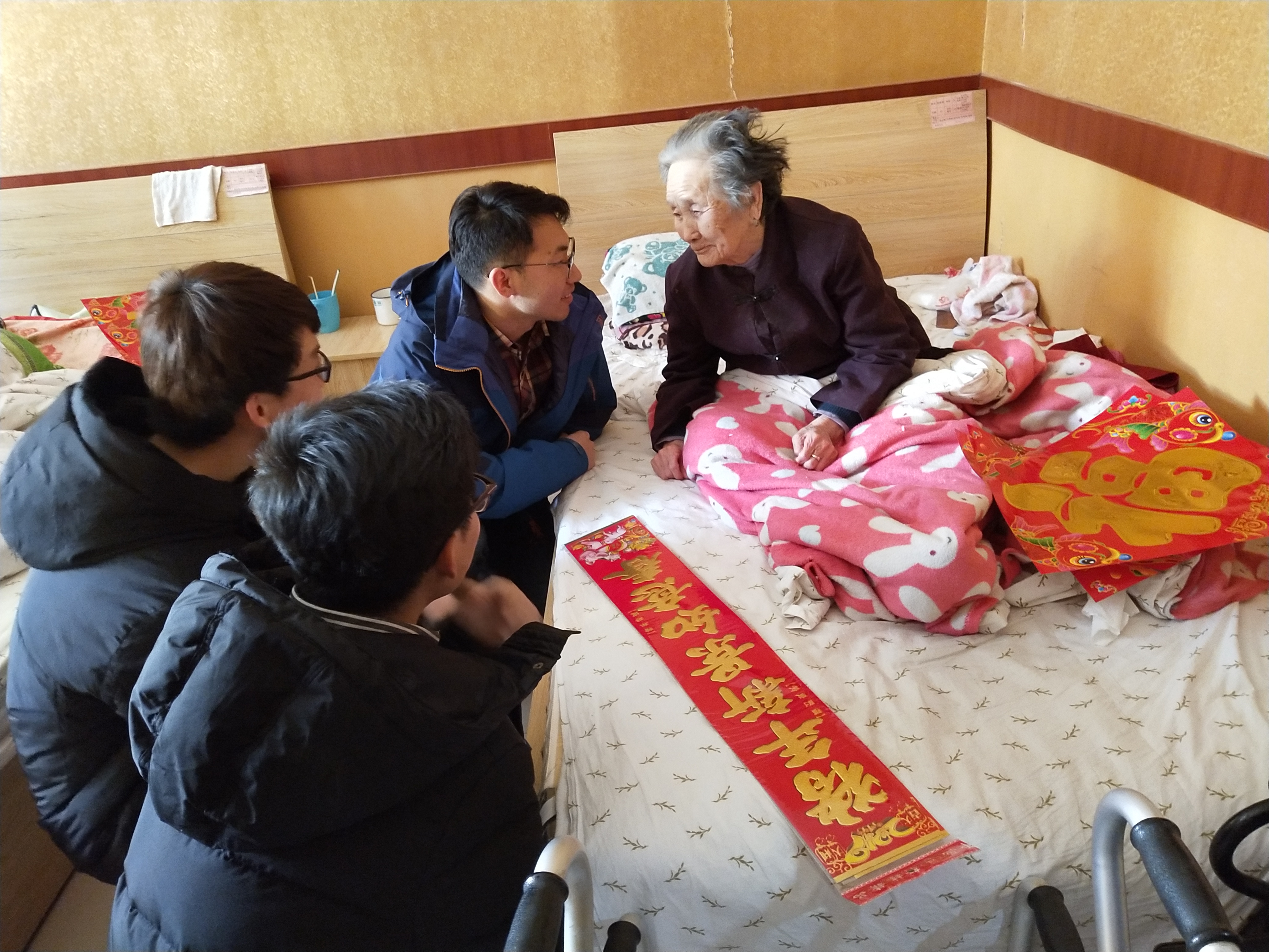 学生们还组织前往“老党员之家”——青岛市黄岛区福爱老年公寓,走进老党员的生活,与他们进行交流。“这四十年的变化可不得了,就拿我自己来说,我开了很多年的船,我感觉航海这方面的发展就很不得了。改革开放初期时候我们航海时方向都是通过我们常年日积月累的经验来判断的,但现在就不一样了,各种导航系统全面覆盖,出门用手机就可以定位,相比当年真的是太不可思议了。” 一位从事多年航海生涯的老爷爷兴奋地说道。同时,学生们也给老党员们介绍了现今的发展,例如移动支付的普及,高铁的运营、VR虚拟体验等新兴事物。最后学生们为老人们购置了拖把、扫帚等生活用品,并为每间房间贴上了对联和福字,为老人们送上新年祝福。