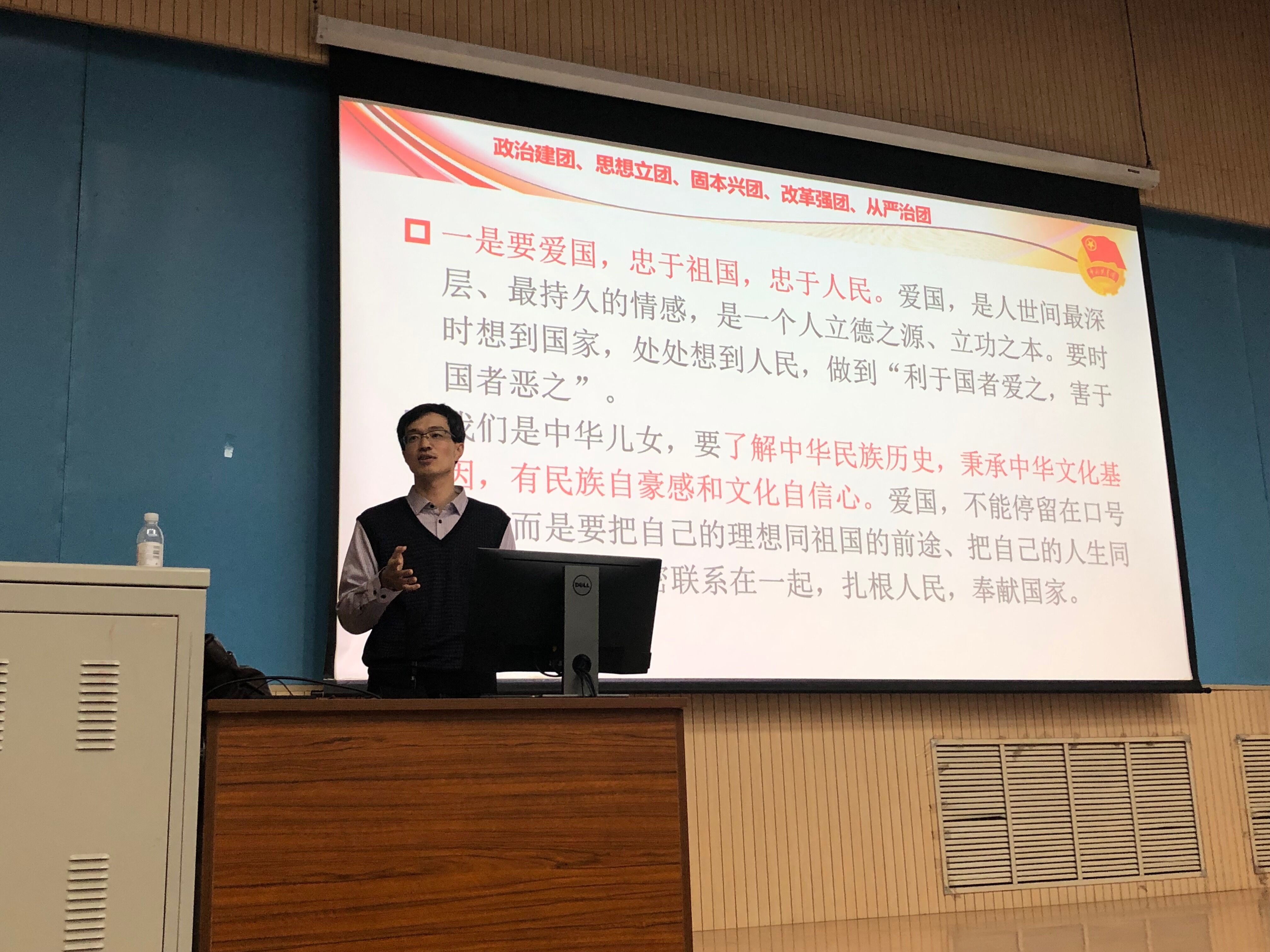 姜飞介绍本期团校相关安排,并向团员们介绍各班团课班主任,并希望团课在为团员们带来学时等实际性的好处的同时更重要的是让团员们思想得到升华。