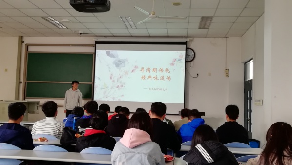 本次活动由唐怀鸣主持,电气1705班全体学生参与。活动伊始,唐怀鸣介绍了本次活动的目地以及活动形式。活动第一项的故事展示环节,唐怀鸣展示了自己制作的清明主题PPT。唐怀鸣说:“清明是我国传统节日,不同地方风俗不一,但都代表着人们对美好的向往”。诗文朗诵环节,学生们三到四人一组,上台展示收集的清明节相关诗句。“燕子来时新社,梨花落后清明”“几多情,无处说”“落花飞絮清明节”“清明时节雨声哗”等诗句被学生们一一吟诵。活动最后,学生们自由组成小组,交流了本次活动的收获。