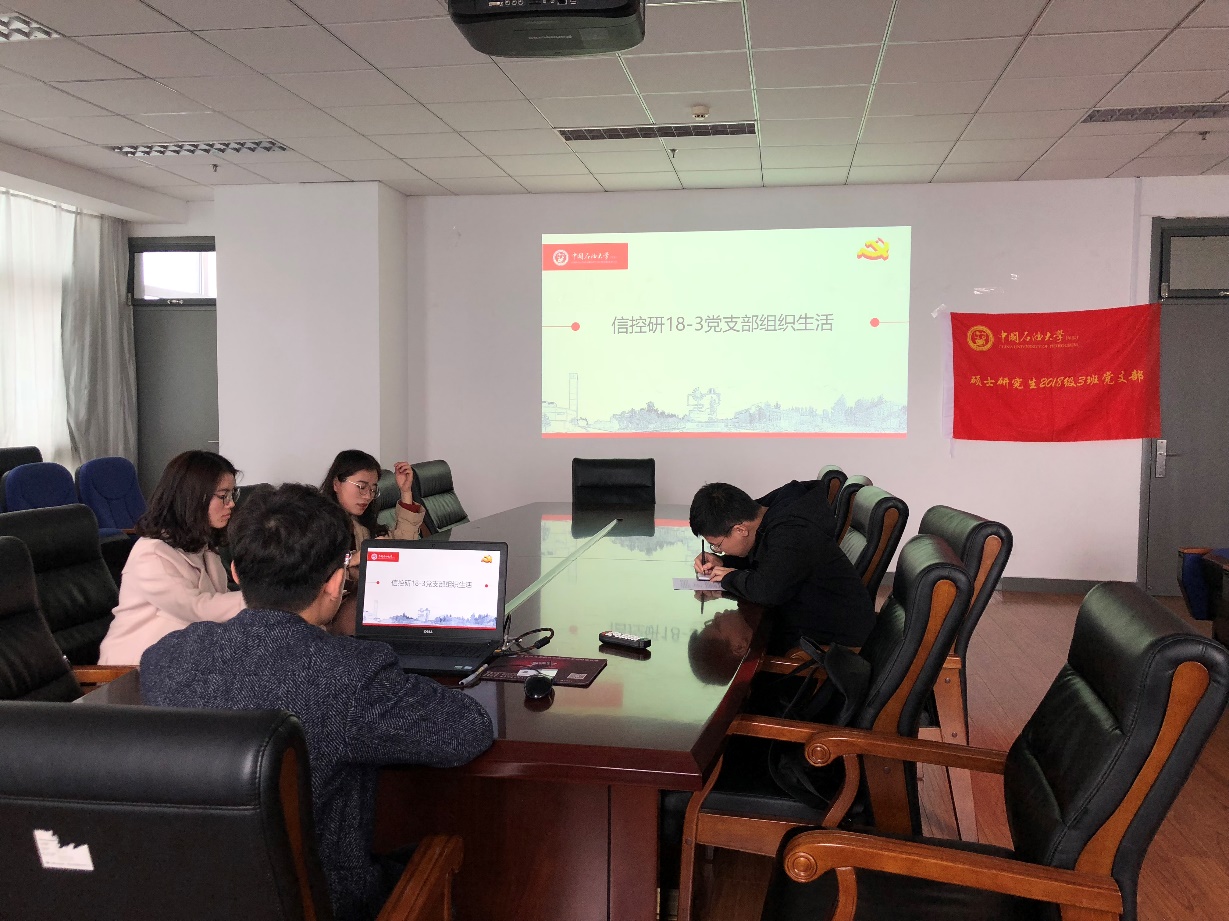 4月27日16时,我院研18-3党支部于工科E1329会议室召开四月份组织生活,此次组织生活主要是为计划五四活动的开展,同时学习《党政领导干部选拔任用工作条例》,学习中共中央办公厅印发《关于解决形式主义突出问题为基层减负的通知》,方便大家交流分享学习心得。会议由党支部书记刘舜超主持,组织委员聂云良记录,5名支部党员参会。
