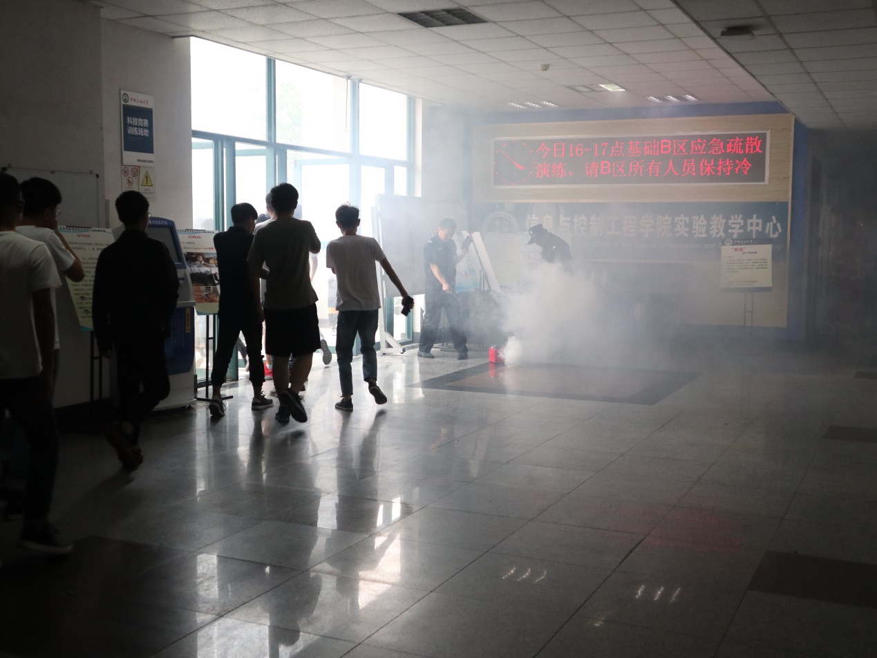 此次演练主要进行了消防疏散逃生和灭火实训两个项目。根据报道过的惨痛教训,在火灾真正来临时,同学们可能会因为缺乏消防常识,比如不会操作专业消防工具而错失逃生良机,因此身陷困境。由于基础实验楼的特殊性,楼内仪器设备复杂,必须锻炼同学和老师们的专业消防能力和逃生能力,使之能够在危险到来时做到有效自救。随着工作人员引发模拟火灾,警报声顿时响起,消防演练正式开始。基础实验楼B区师生听到警报声以后,在工作人员的安排下,迅速进入状态,从三个安全通道紧张有序地撤离。等全体师生安全撤离到楼下保卫处所设指定地点以后,公安处人员给大家讲解了一些基本的消防安全知识,详细说明了灭火器的使用方法,为大家提供了专业指导。同学们仔细听讲,先是认真观摩了现场灭火操作,然后自发积极参与尝试了灭火器的操作使用。现场效果良好,同学们基本掌握了灭火器正确合理的操作方法。最后,大家有序撤离,返回各自实验室,工作人员负责清理现场。