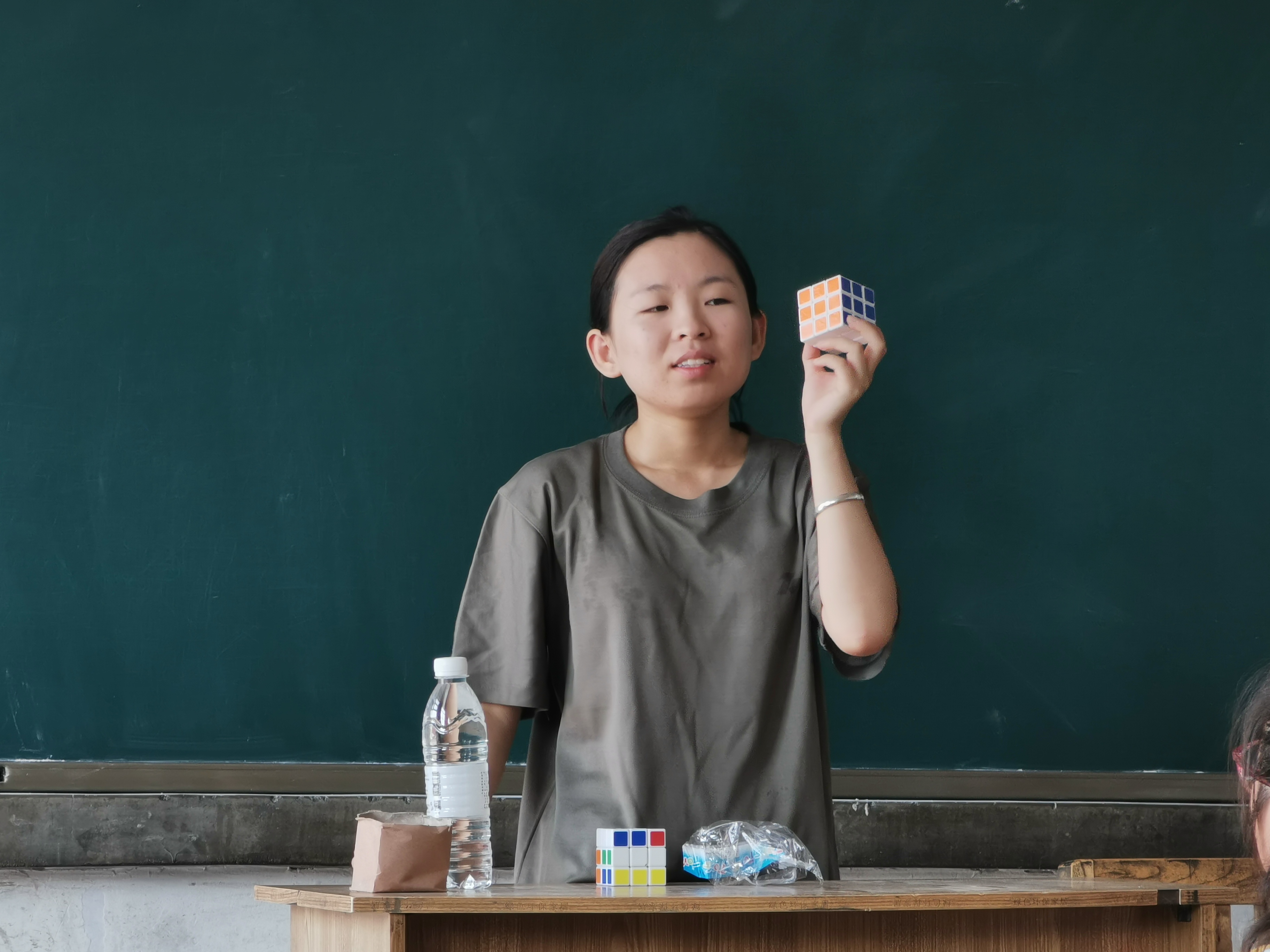 第一堂课是魔方课,由有着四年支教经验的闫娜带队指导老师授课。延续了雁翎支教队六年的传统,闫娜从基础教起,讲述点线面三个基础点,并从魔方的基础构造和基础花色抓起,循序渐进。在学生理解后,又继续教授一阶魔方的基础理论。吴街小学的孩子反复练习,在老师要求举手向大家演示的时候,一双双小手齐刷刷的举起来,争相向闫娜展示自己的学习成果。“看到孩子们学得认真,我们自然教的更加起劲,这里的学生一点不比城里的孩子笨,我欣慰的同时也很惋惜,因为他们没有更好的学习平台去提升自己。”闫娜如是说。