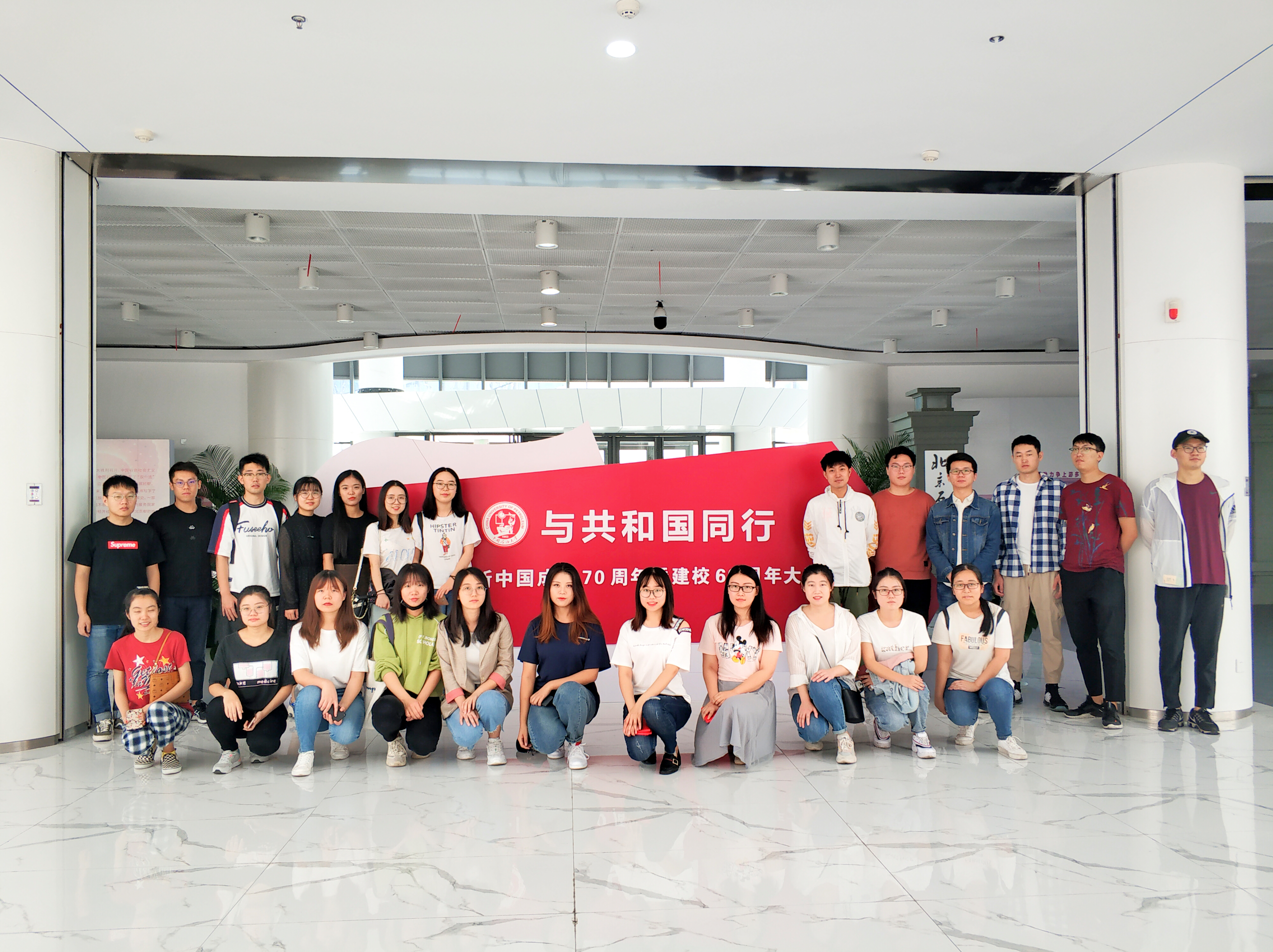 为品味石大66年辉煌史,感悟石大历史文化,上午十时,在支部书记的带领下,支部成员井然有序地进入图书馆参观“与共和国同行”展览。展馆以图文并茂的信息和实物,展示了建校66年来学校在各个方面的精神风貌和杰出成就,对学校人文、地理、教学、科研及对外交流等方面都有详细的阐释,展现了石大各个时期的办学成果以及各种名人事迹,使同学们对石大有了更深入的了解,激励同学们要加强自身学习和锻炼,矢志成栋梁的决心和毅力。参展完成后,大家纷纷在“与共和国同行,庆祝新中国成立70周年暨建校66周年”白板上写下了自己对祖国和母校的寄语。为唱响爱国情怀,表达对祖国的热爱和崇敬,参展结束后大家来到创造太阳面前一同高歌《我和我的祖国》,大家用高亢激昂的歌声集体向祖国献上最深情的祝福。具有仪式感的齐唱,让人心潮澎湃,对祖国的满腔热爱之情涌动在每一个人的心中。党支部成员张素说:“今年是我们伟大的祖国70华诞,在这举国欢庆的日子里,让我们青年学子为祖国共唱这首《我和我的祖国》,以青春的名义向祖国致敬,希望我们的祖国更加伟大、更加强盛!”