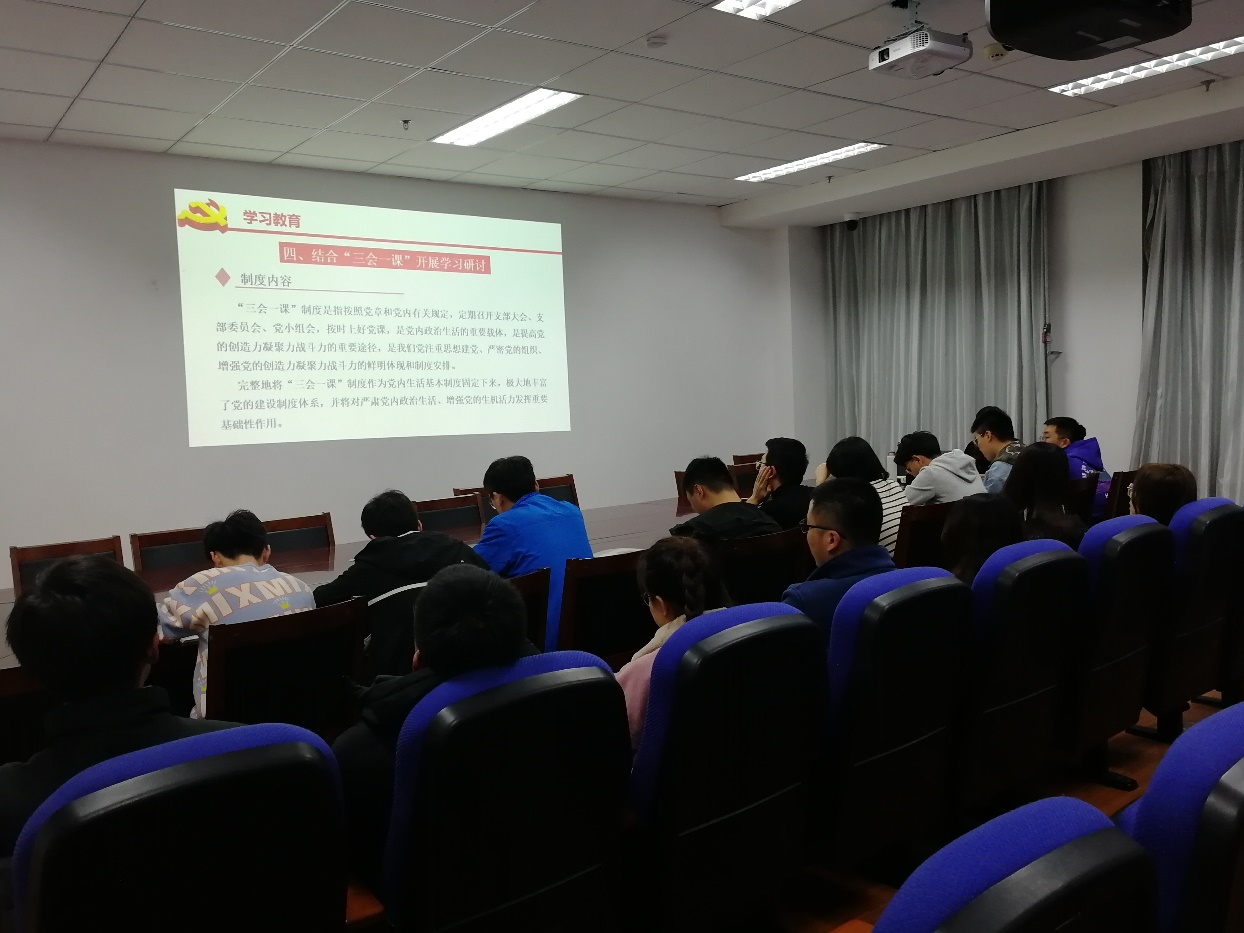 “三会一课”制度是党组织生活的基本制度,是健全党组织生活、加强党员教育、严格党员管理、完善党员监督、强化党员服务的重要制度,是我党经过长期实践证明的一种行之有效的、必须长期坚持的党组织生活制度。会议开始,王健带领大家学习“三会一课”的具体内容。“三会”是指支部大会、支部委员会和党小组会。“一课”指党课学习。学习“三会一课”制度的具体内容和形式后,党员同志对“三会一课”制度进行了热烈的讨论与分享。党支部书记潘超指出,“三会一课”制度是组织生活的一项重要内容,是加强党员管理、强化基层组织建设的重要措施。要总结落实“三会一课”经验做法,每月要结合工作实际,确定不同主题,最少召开一次集中学习。