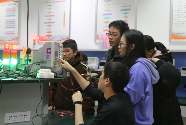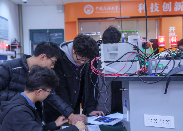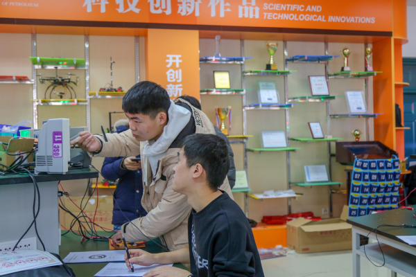 验收作品开始后,门外学生们根据所选的不同题型有序地进行排队等待自己作品的检验。门内验收作品负责人在自己的位置对进来的学生先进行签到,然后对学生作品进行检查,并根据作品情况进行打分。验收结束的学生带着自己作品有序离开实验室。