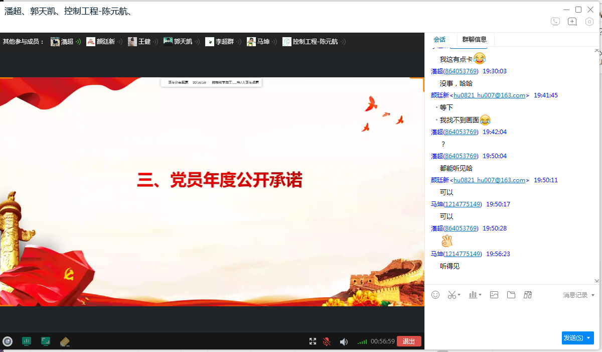 第三环节为党员年度公开承诺,与会党员皆进行公开承诺,结合疫情防控期间要求,与党员承诺严格遵守学校规定,带头做好学习规划,加强与同学的交流,主动承担防控责任,发挥党员的模范带头作用。