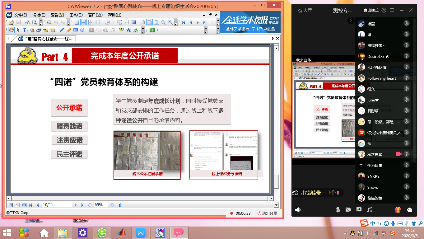 为了落实学校疫情防控工作安排,推进学院“四诺”党员教育,引导同学们在寒假期间积极抗击疫情,发挥党员先锋模范作用,助力疫情防控阻击战取得胜利,我院测控专业第二党支部于3月5日开展“疫路同心践使命”线上专题组织生活会,测控专业第二党支部党员与积极分子参与此次会议。