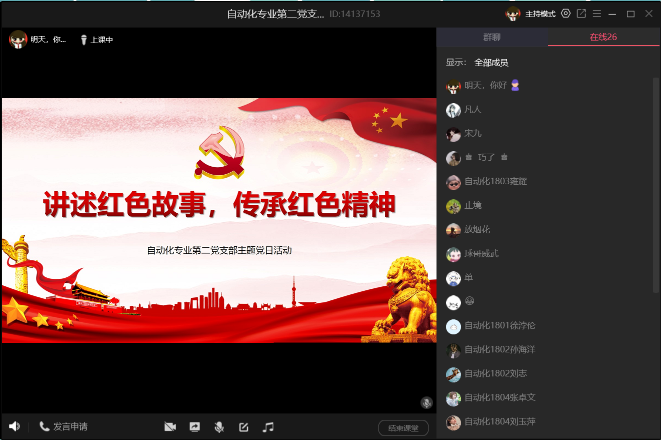 为加强红色基因教育,传承红色精神,我院自动化第二党支部2020424日下午4点在QQ会议上举行“讲述红色故事,传承红色精神”主题党日活动。活动由党支部书记高一鸣同志主持,全体正式党员、预备党员和入党积极分子参与此次活动。