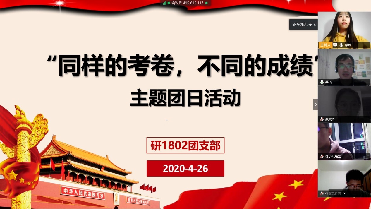 为了引导团员们深刻理解全国一盘棋、集中力量办大事的国家制度和治理体系优势,深刻感受中国共产党的坚强领导、中国特色社会主义制度的显著优势,控制研18-2团支部于4月26日晚开展“同样的考卷,不同的成绩” 线上主题团日活动,研究生辅导员姜飞和控制研18-2团支部成员参与此次活动。
