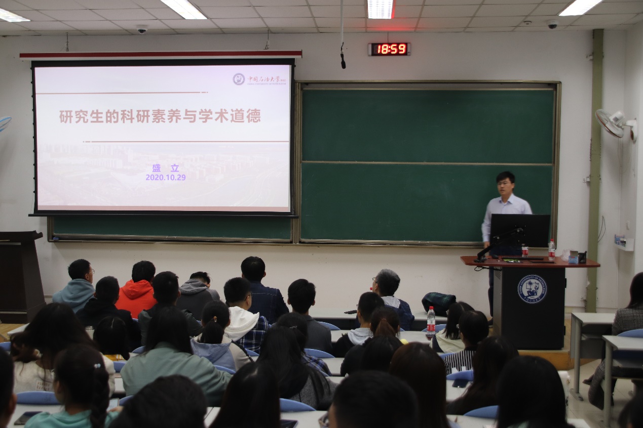 首先,姜飞致开场词,热烈欢迎2020级新生。随后,盛立教授对于学院基本概括简要介绍,包括学院的发展历程、学位点建设情况等。盛立教授重点介绍了研究生的基本科研素养,他指出当代研究生需要掌握科学研究的基本规律,善于发现问题、分析问题、解决问题,并援古证今,强调发现问题是关键一环。盛立教授对于科研论文的写作与发表中的论文撰写、论文投稿、论文修改三个环节进行介绍。并要求新生明确研究生阶段相对于本科阶段具有的鲜明学术研究特点,要实现从学习到创新,被动到主动,个人到团体的转变。接着,盛立教授针对研究生的基本学术道德,对于抄袭、一稿多投、伪造数据等问题拉起学术道德红线。姜飞做总结性发言,以亲身经历告诫研究生阶段应与导师保持良好的沟通,切忌闭门造车,并对优秀学长的事迹进行分析,勉励同学们脚踏实地,努力奋斗。最后,苏书记对20级新生寄语三点:一是研究生要具有拼搏精神和时间观念,在研究生阶段要刻苦努力,挑战极限,磨练人生态度,并指出青春是用来奋斗的。二是强调导师的重要性,号召大家通过正确的舆论渠道发表意见,为学院发展建言献策,注重网络言行,并不断修炼本领、磨练品性,做到学有所成、学有所乐。三是身心健康是基础,研究生期间要养成自身爱好,保持身心健康。