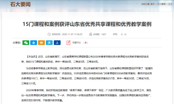 为总结春季学期线上教学经验,深化信息化教学改革,在山东省教育厅指导下,山东省高校课程联盟组织开展了“疫情防控期间优秀共享课程与优秀教学案例”评选活动。55所成员高校共申报400余门共享课程和500余项教学案例,最终评选优秀共享课程195门,其中一等奖40项、二等奖60项、三等奖95项;评选优秀教学案例257项,其中一等奖50项、二等奖76项、三等奖131项。我校15门课程和案例获奖,其中一等奖6项、二等奖5项、三等奖4项。