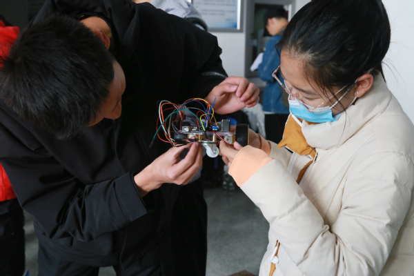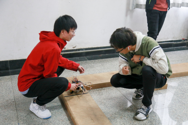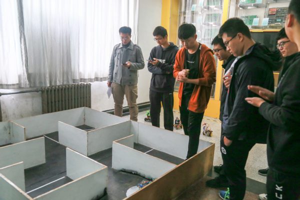 成果验收于早上八点正式开始,同学们陆续将做好的小车交于组委会检查,并按顺序排队等待上场地检验成果。组委会工作人员分工明确,计时、录像、记录测试项得分,有条不紊地对参赛作品进行验收。其中,“智能寻迹小车”题目的参赛选手均为大一新生,尽管对单片机知识了解尚浅,仍有许多参赛团队在短短半月完成成车制作和调试,实现寻迹功能。更有不少同学别出心裁,做出形状、大小各异的寻迹小车,为比赛增添了许多趣味性。由大二、大三学生为主要参赛选手的“智能避障避险小车”和“机器人灭火”题目相对难度较大,对参赛选手单片机知识及机器人各模块联动的能力要求更高。“代码的逻辑是遇到的最大问题,我们通过模拟通过赛道的过程对代码进行不断修改。”参赛选手徐晓阳这样说道。