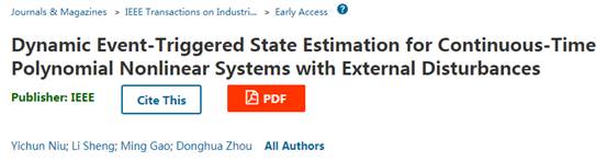 近日,太阳集团tyc234cc盛立教授团队在连续时间多项式非线性系统的状态估计方面取得新进展,相关研究论文Dynamic Event-Triggered State Estimation for Continuous-Time Polynomial Nonlinear Systems with External DisturbancesIEEE Transactions on Industrial Informatics在线发表。博士生牛艺春为第一作者,盛立、周东华教授为共同通讯作者,太阳集团tyc234cc为第一署名单位。