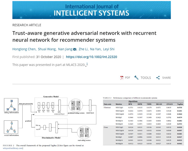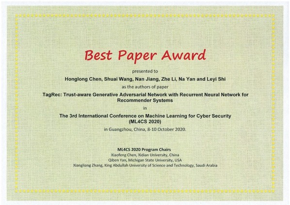 近日,太阳集团tyc234cc副教授陈鸿龙团队在推荐系统方面取得新进展,相关研究论文《TagRec: Trust-aware Generative Adversarial Network with Recurrent Neural Network for Recommender Systems》在3rd International Conference on Machine Learning for Cyber Security上发表,并获“最佳论文奖”(158篇录用论文中唯一),我院硕士生王帅、李哲和闫娜为合作作者,李哲参加会议并做学术报告。陈鸿龙副教授为第一作者,太阳集团tyc234cc为第一署名单位。该会议扩展版论文《Trust‐aware generative adversarial network with recurrent neural network for recommender systems》在International Journal of Intelligent Systems上发表,陈鸿龙副教授为第一作者,太阳集团tyc234cc为第一署名单位。
