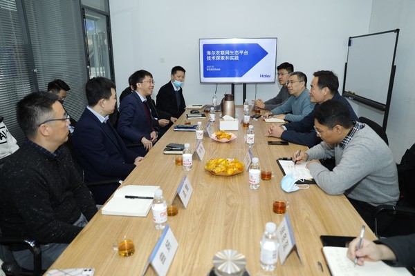 2021年1月27日下午,我院于连栋院长,刘伟锋常务副院长,盛立副院长,张冬至副院长,苏兴党委副书记一行五人访问海尔衣联网。海尔衣联网研发总监许升,海尔衣联网研究院执行院长孟毅,海尔衣联网人力资源总监闫俊青、海尔智家HR平台招聘总监曲妍、海尔衣联网智慧技术总监黄振兴等陪同参会。会前,海尔衣联网云裳物联总经理孙传滨陪同参观了海尔衣联网一号店,展示衣联网以用户为中心,在洗、护、存、搭、购方面的解决方案及产品展示与应用。