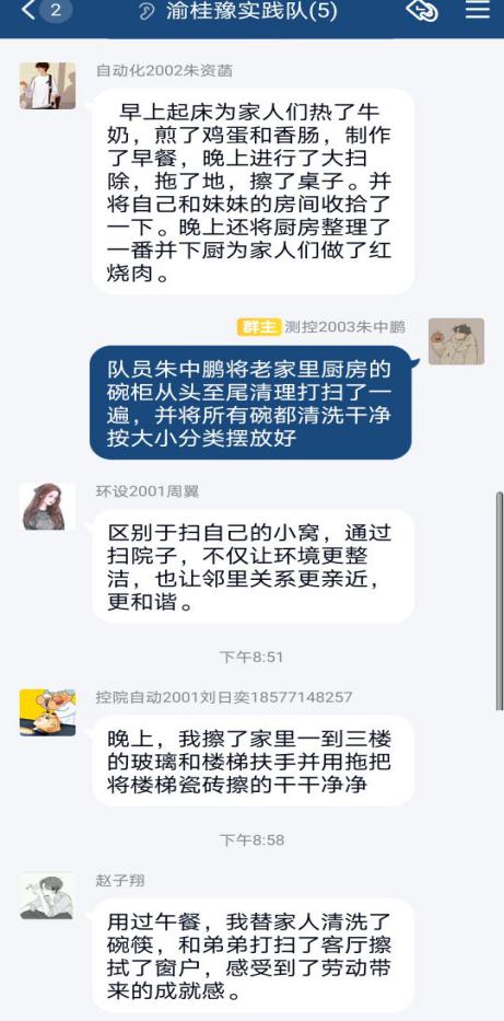 队长朱中鹏在老家中为家人清洗了碗碟并在柜子中按照大小分类摆放整齐,将厨房橱柜整理得井井有序。队员周翼在家中将自己的家庭整理干净,将老家的院子中的落叶,垃圾等清扫干净,为老家打造了良好舒适的环境。队员刘日奕将家中一楼至三楼的玻璃和楼梯扶手均清洗干净,并用拖把将楼梯的瓷砖仔细地拖干净。队员赵子翔在用过午饭以后为家人洗碗,并将家中的玻璃都认真清洗了一遍。使家中更加阳光,家庭氛围更加浓厚。队员朱资菡在家中进行了大扫除,在午饭过后将各类调料收拾整理,在架子上摆好,并将厨房常年积攒的油污用肥皂水处理干净。