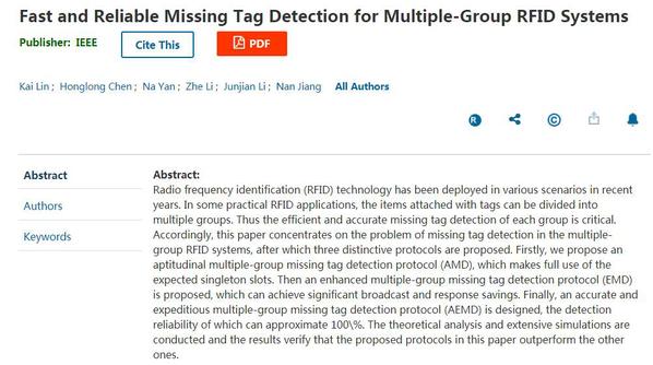 近日,太阳集团tyc234cc副教授陈鸿龙团队在RFID方面取得新进展,相关研究论文《Fast and Reliable Missing Tag Detection for Multiple-Group RFID Systems》在IEEE Transactions on Industrial Informatics 上发表,博士生林凯和陈鸿龙副教授为共同第一作者,陈鸿龙副教授为通讯作者,太阳集团tyc234cc为第一署名单位。